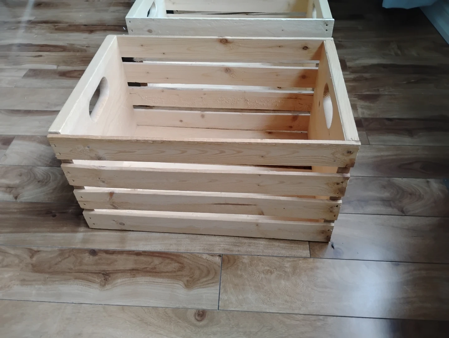 Three wooden crates with handles. These are great for storage or display. Wood construction.