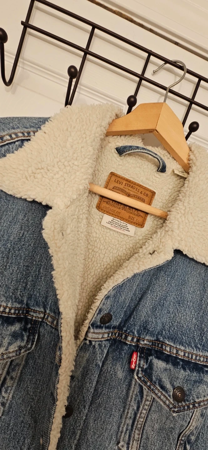 A classic Levi's denim jacket with a warm sherpa lining. It features a vintage fit and is size XL. Perfect for staying warm and stylish during cooler weather!