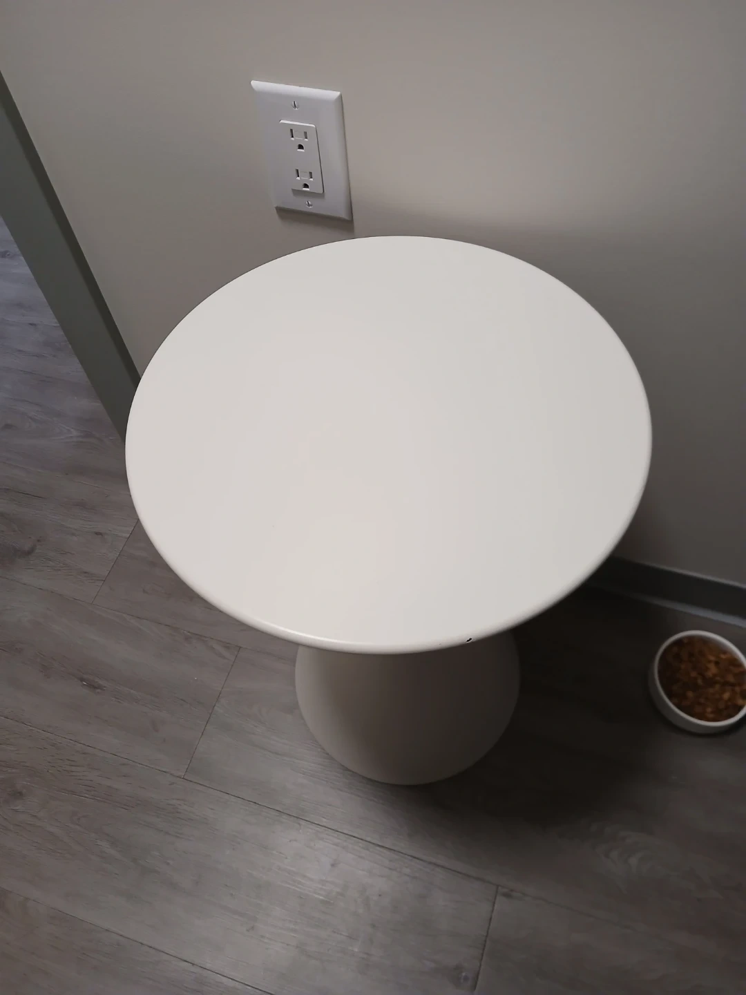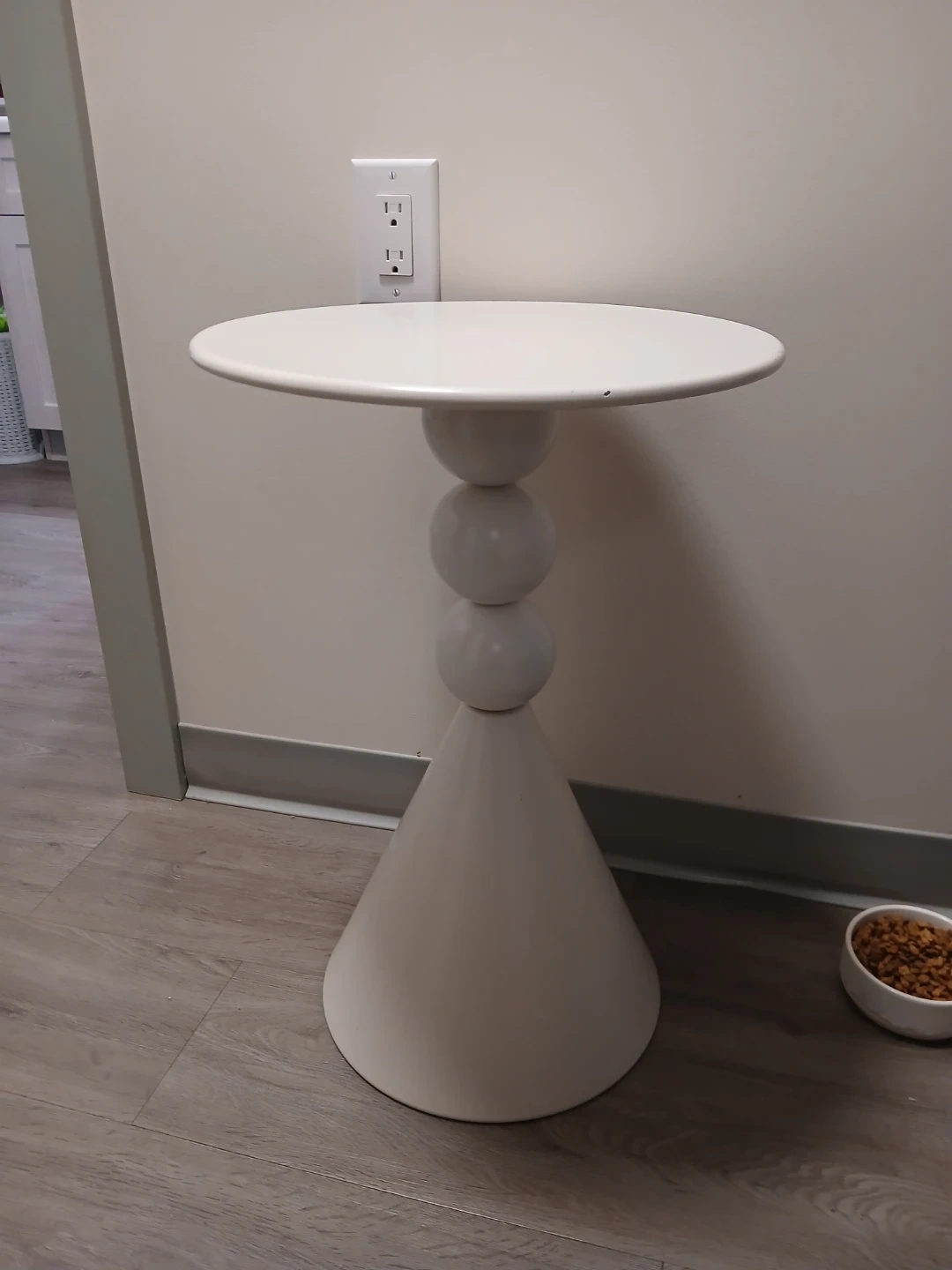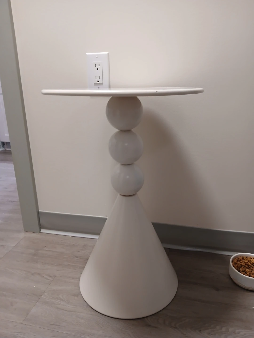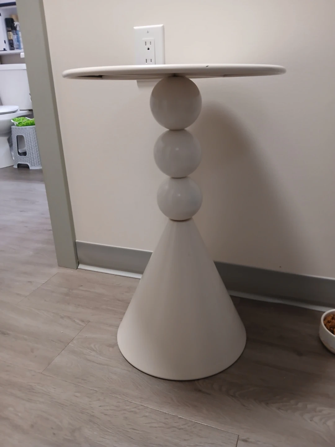 This accent table has a unique design with a cone base and stacked spheres supporting the top. It's a versatile piece for any room. White colour.