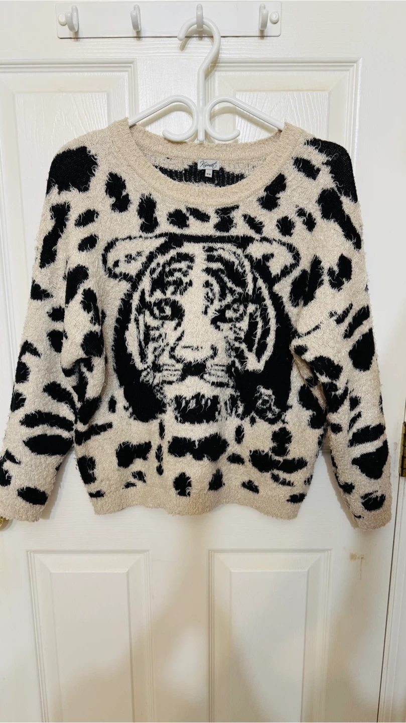 Fuzzy crewneck sweater from Kismet featuring a bold tiger face graphic. It's a size medium. Great for adding a bit of fun to your outfit!
