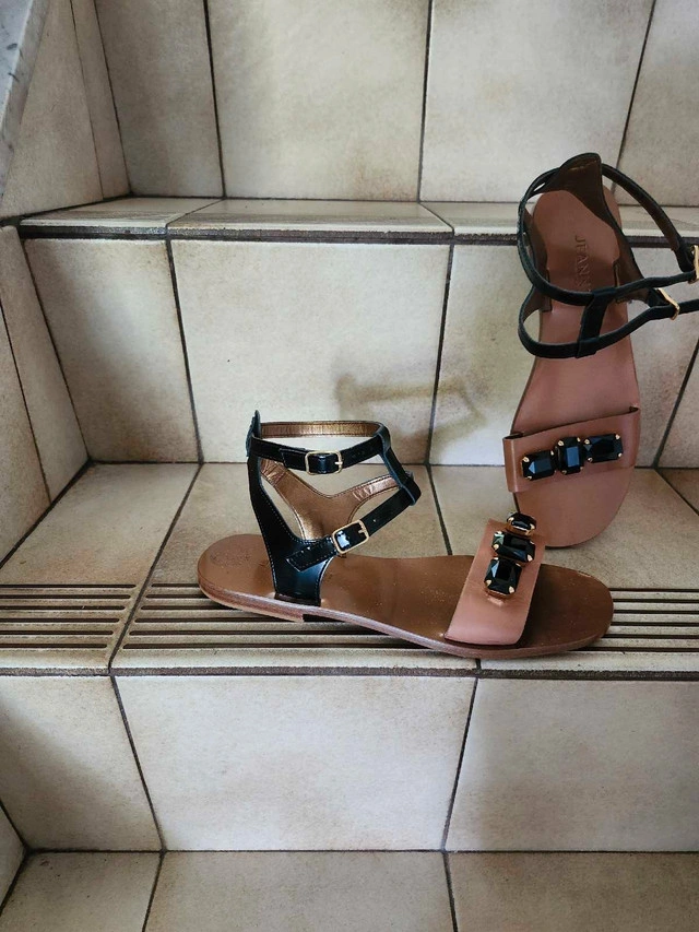 18JEANNOT DESIGNER Italian leather upper and soles with gemstones band. Flats with double ankle straps. Never worn. Beige and black colour leather. Size 8.