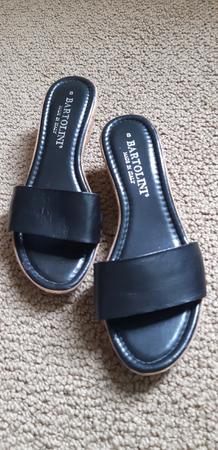 826Hardly worn! Black leather sandals by Bartolini These stylish sandals feature a black leather upper and a comfortable wedge heel. Perfect for adding a touch of elegance to your summer outfits! Size 8