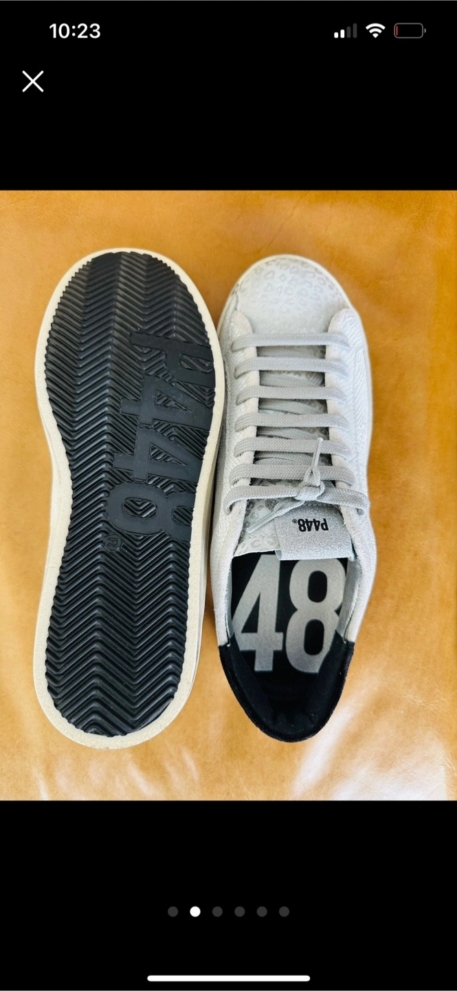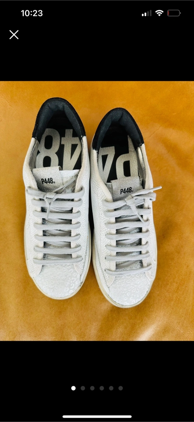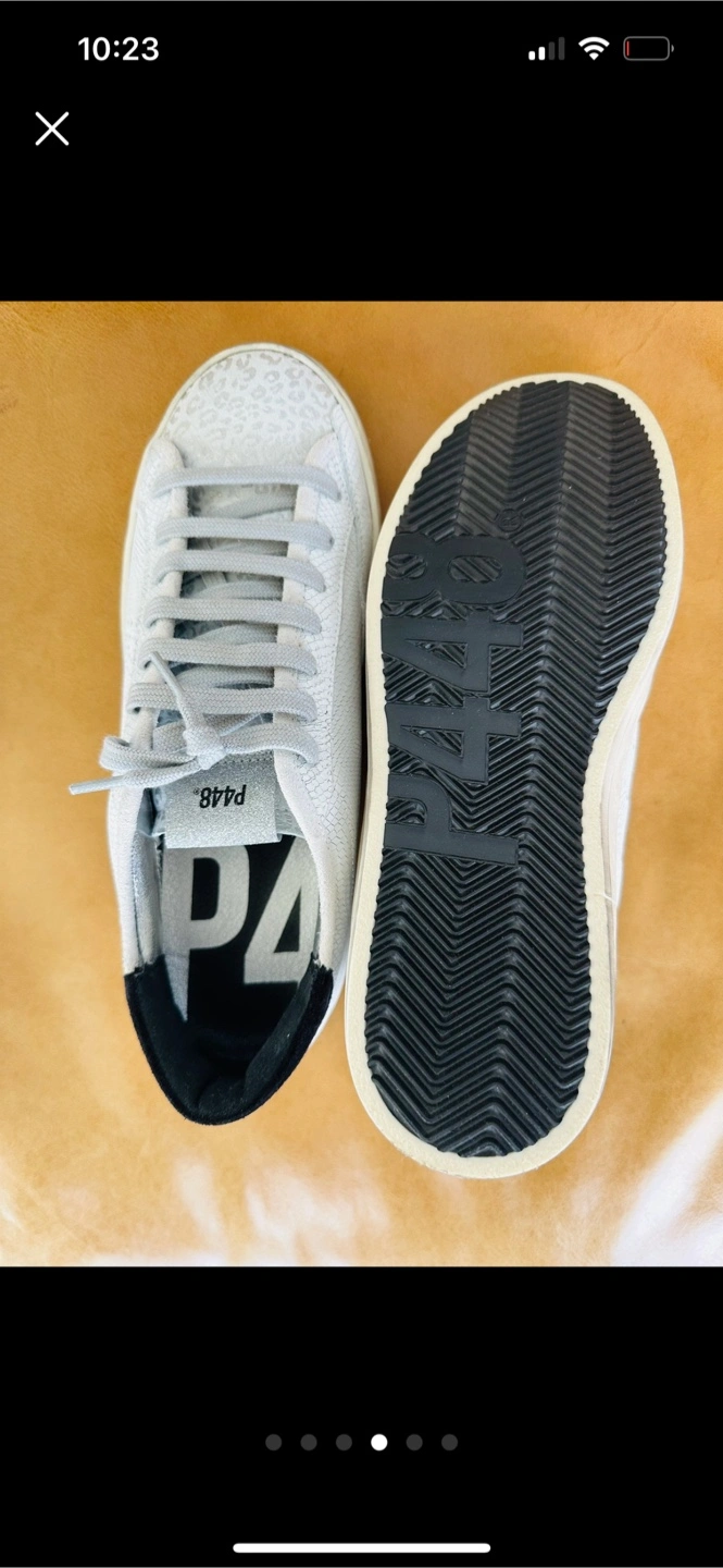 Women's P448 John sneakers. Grey leopard print. Low-top style. Lace-up closure. White rubber sole. Those marks are not dirt, they are intentional by design to make the shoes look Rugged. Extra brown laces included. Made in Italy.