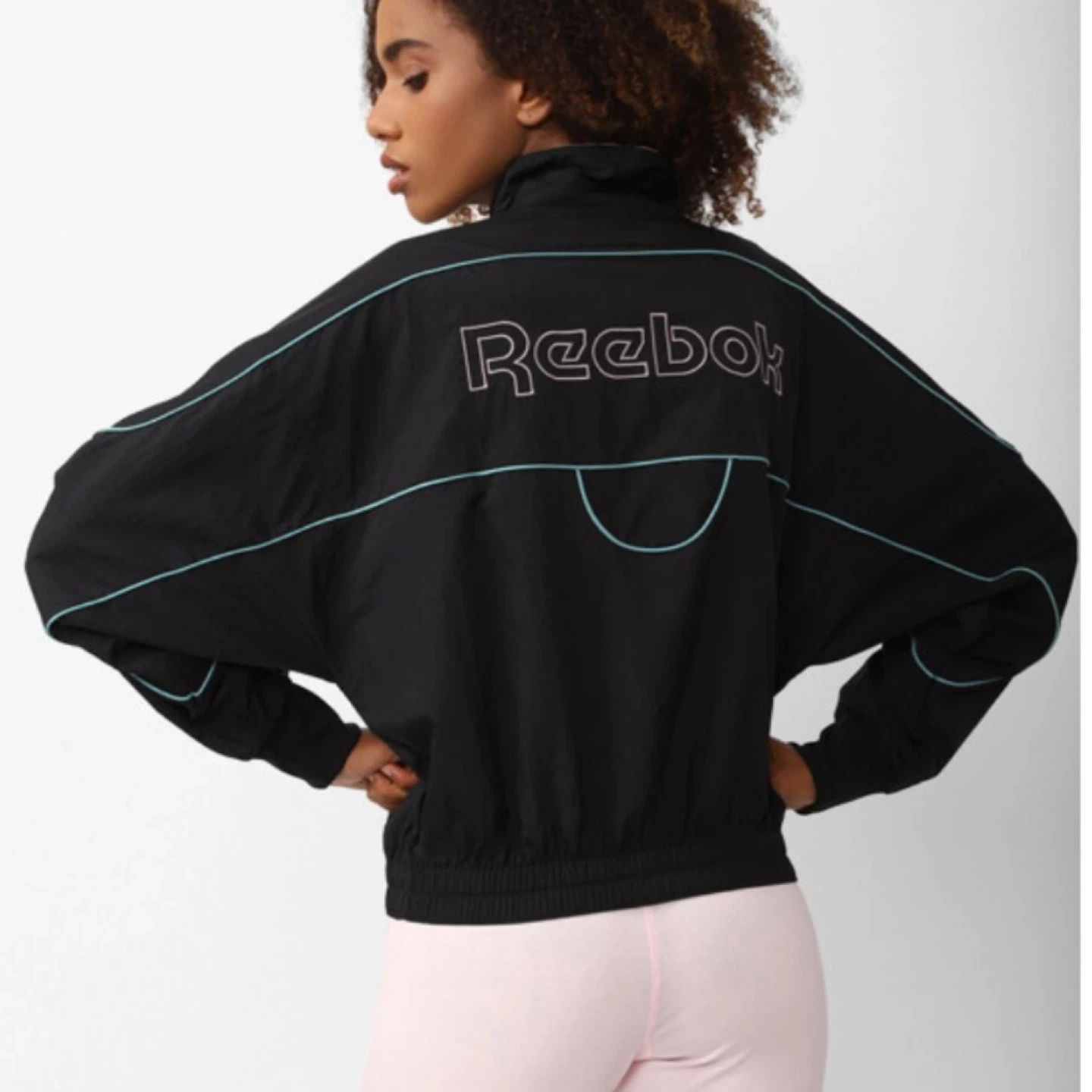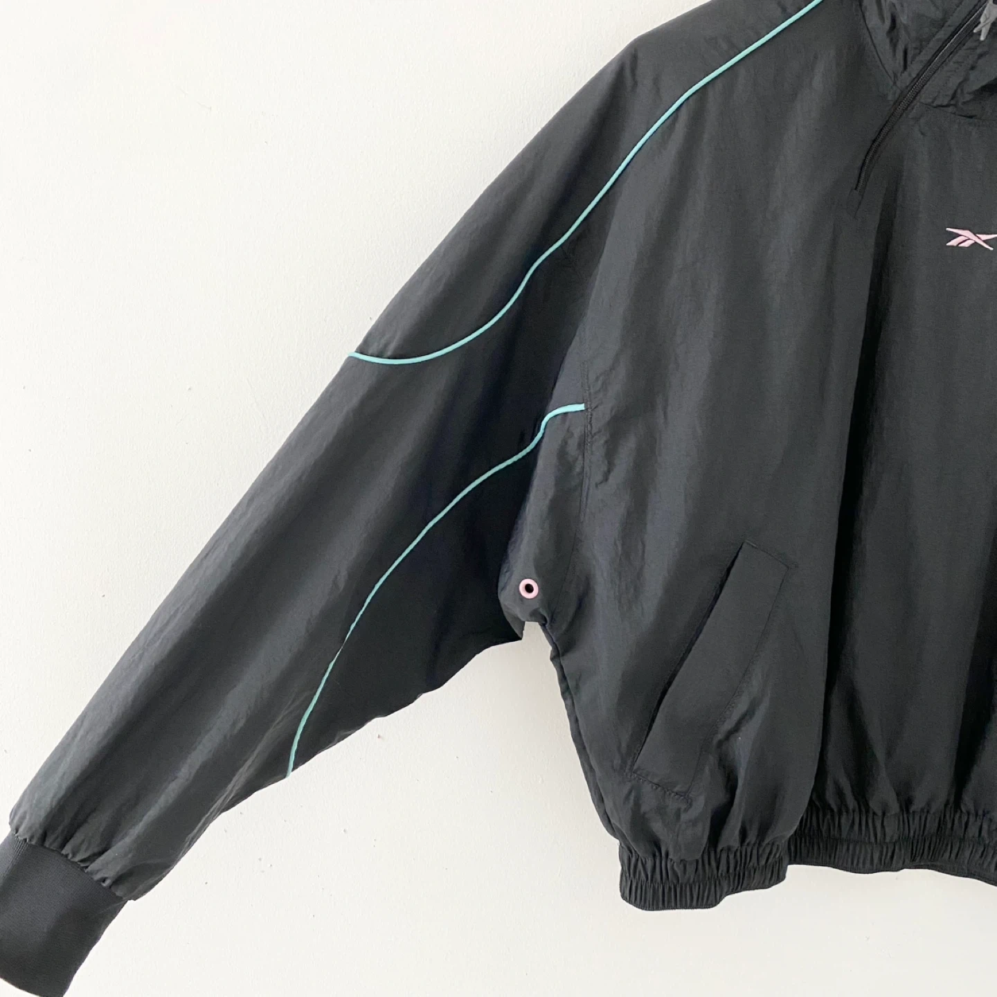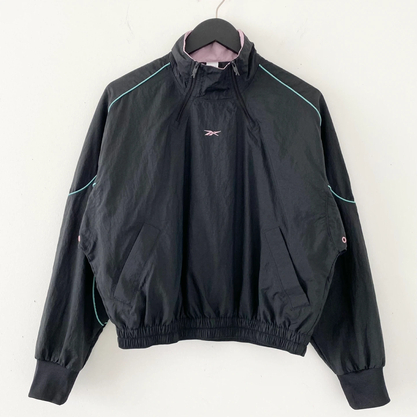 Reebok heritage windbreaker with zipped mockneck. It also features batwing sleeves, contrast corded piping and elasticated waist band. There's no staining or damage, Ots clean and in excellent condition.