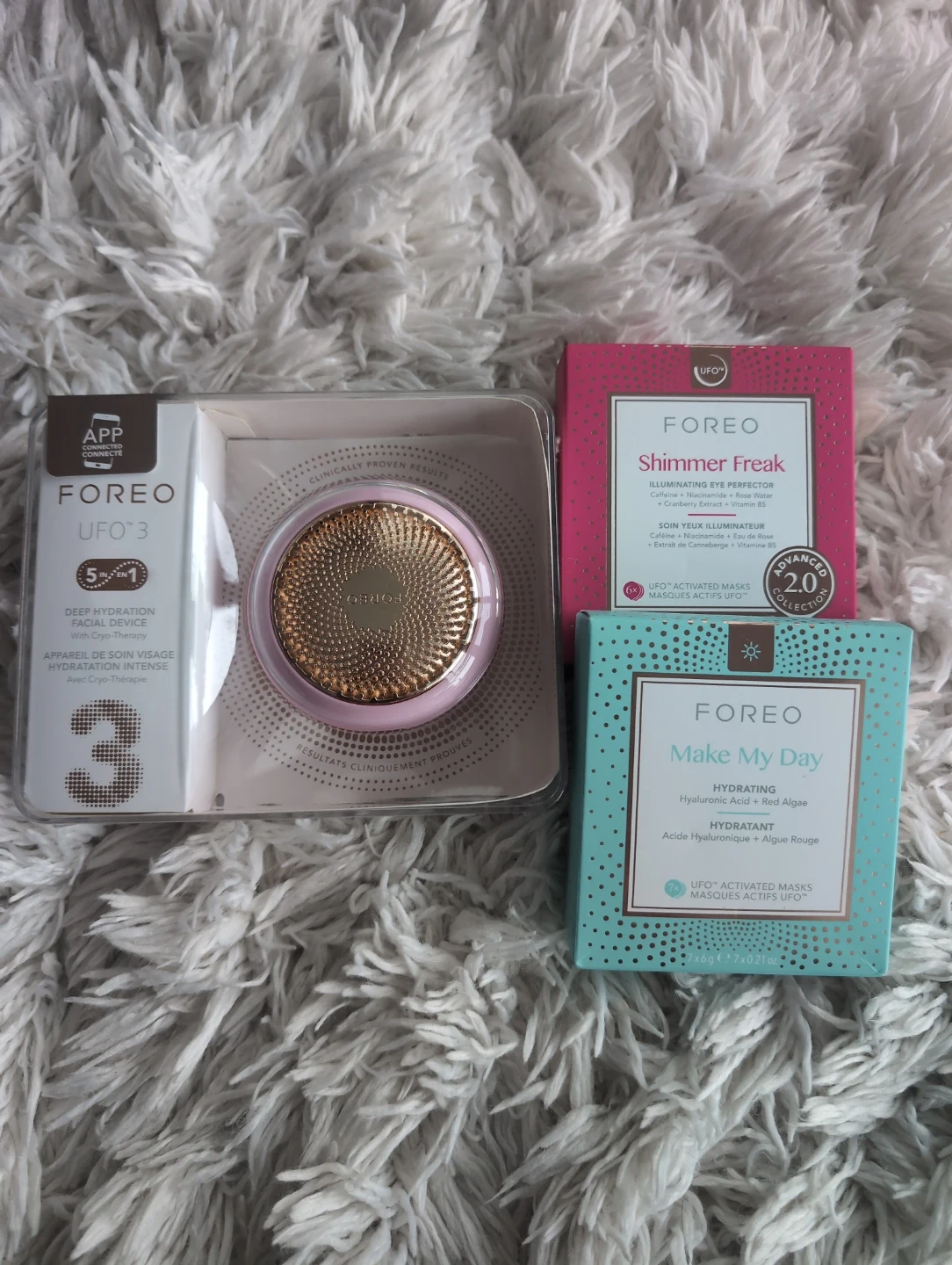 Selling a FOREO UFO 3 facial device with two boxes of UFO activated masks: Shimmer Freak illuminating eye perfector and Make My Day hydrating masks