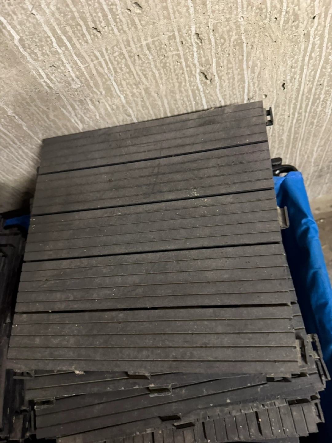 Bundle of interlocking deck tiles for outdoor flooring. Black, plastic material. Easy to connect and customize your space.