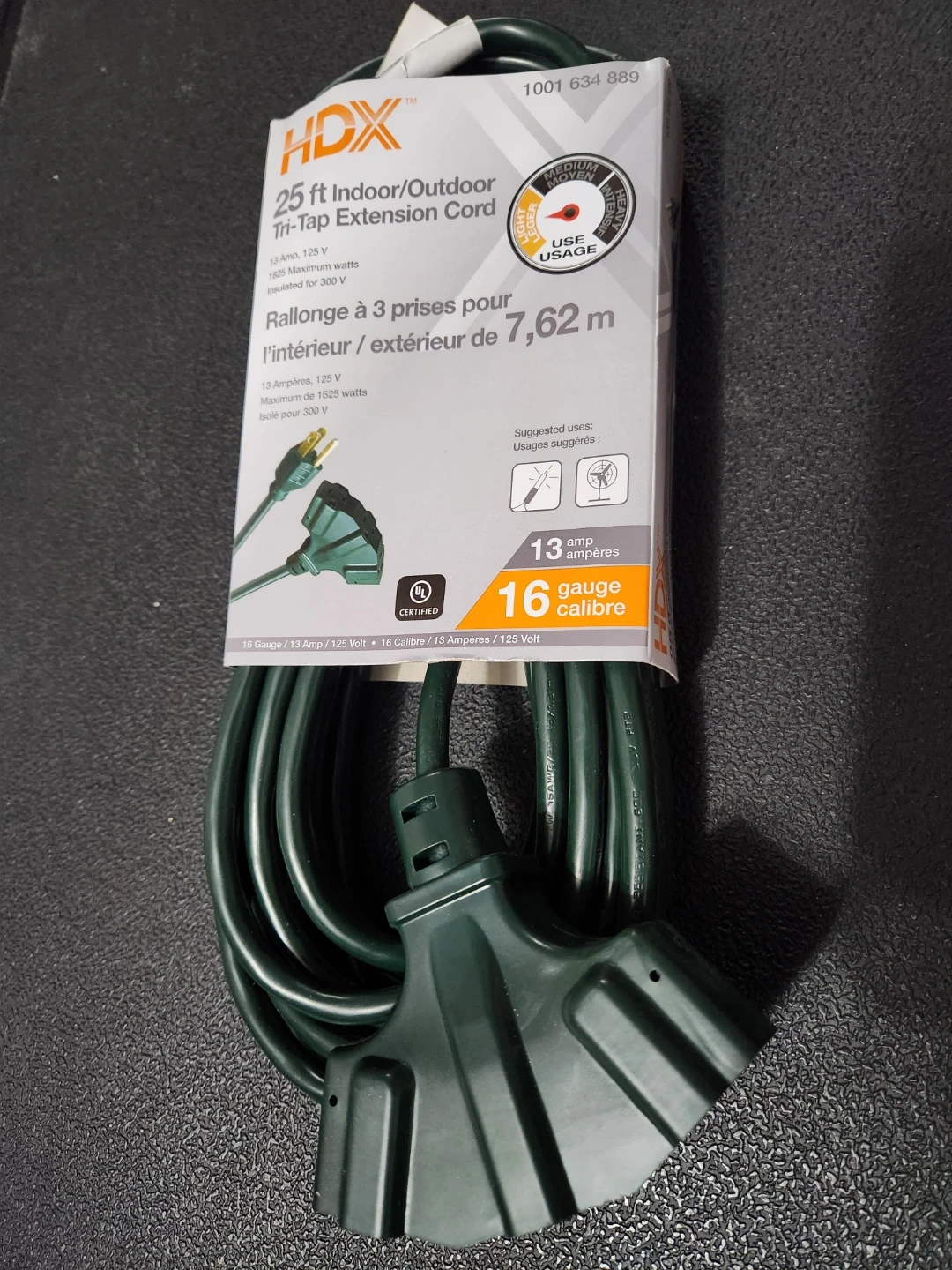 Selling a HDX 25 ft indoor/outdoor tri-tap extension cord. It is 13 Amp, 125 V, and 1625 maximum watts. Rated for 300V.