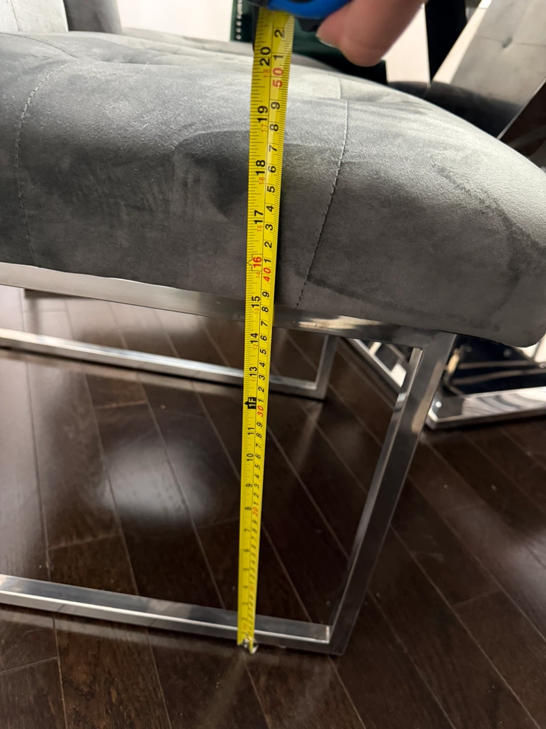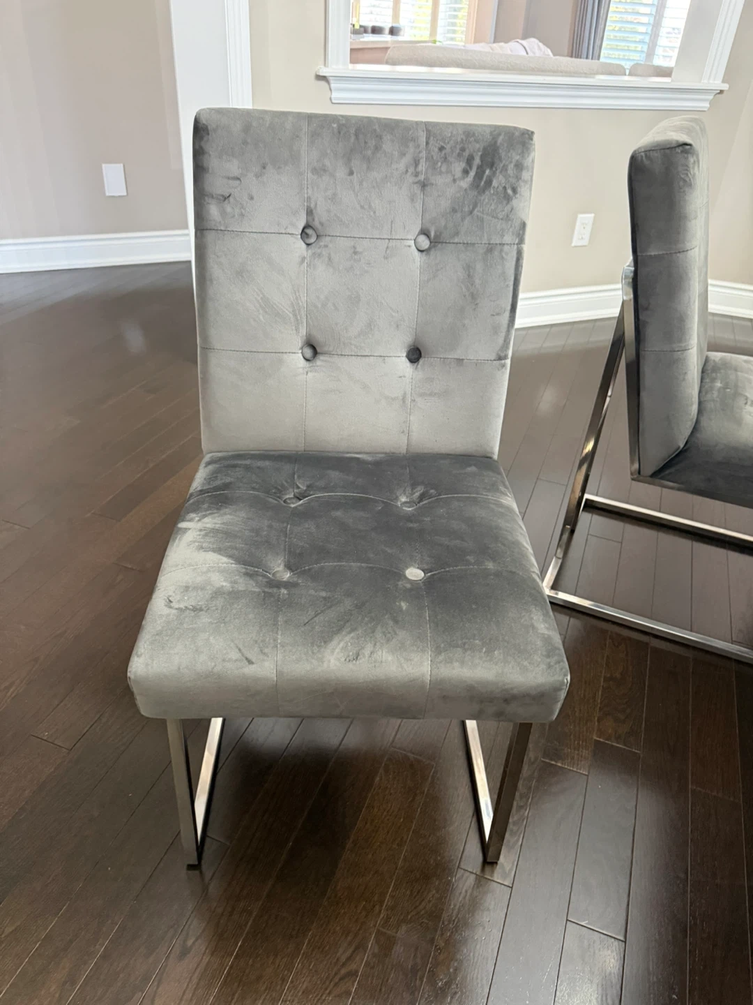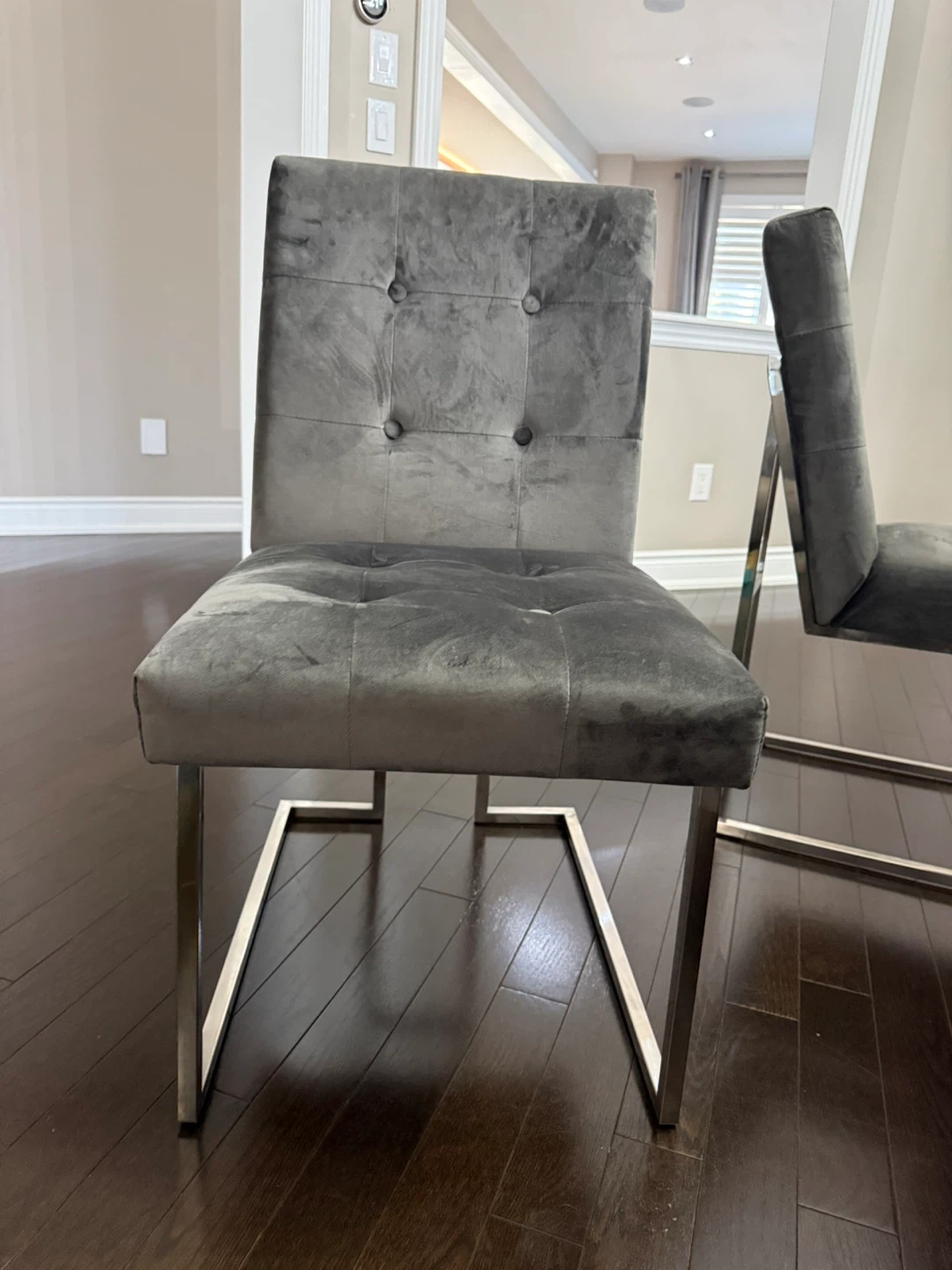 These four dining chairs feature a soft grey velvet upholstery and 2 green accent chairs. They're built with sturdy chrome legs .