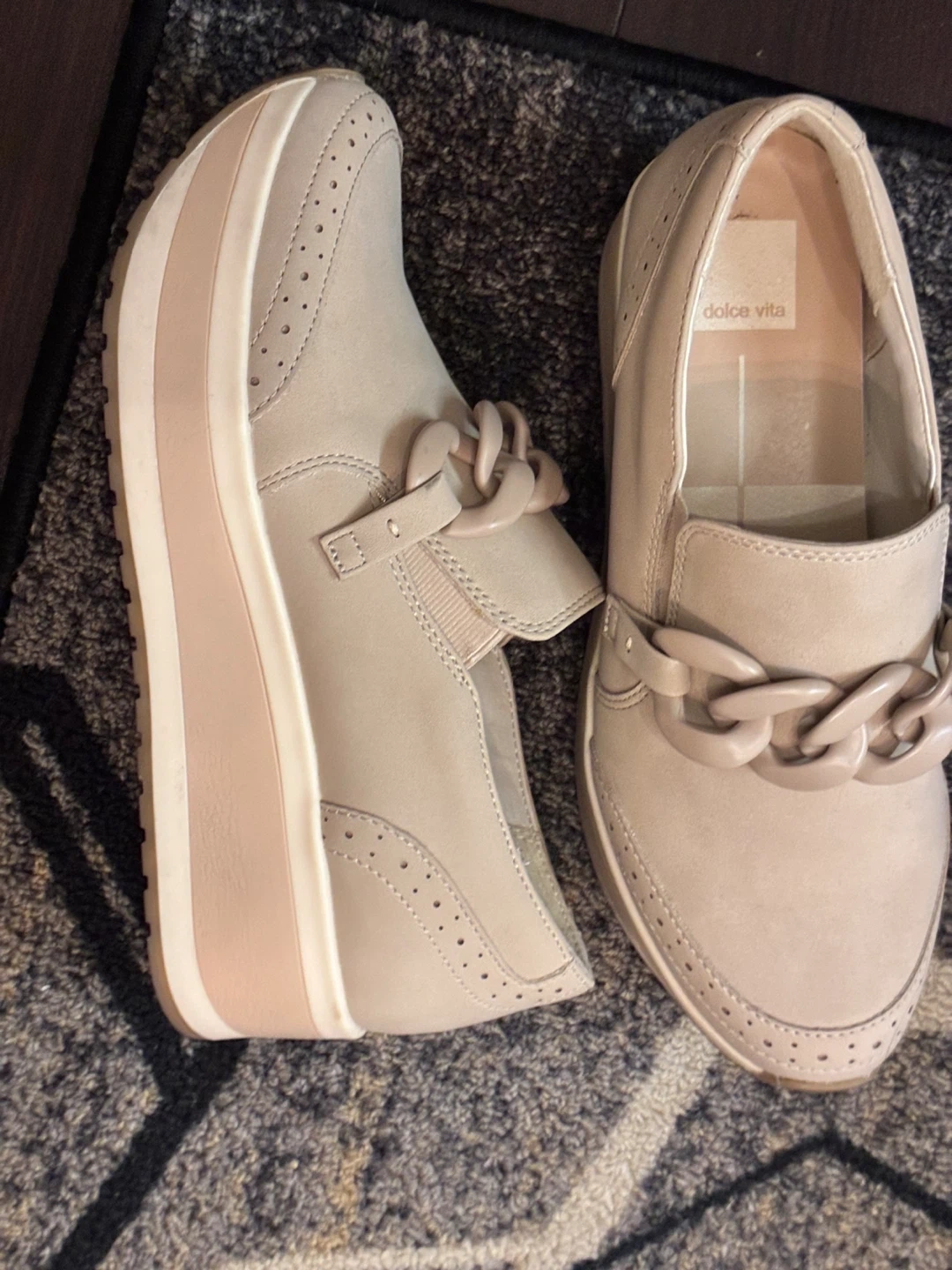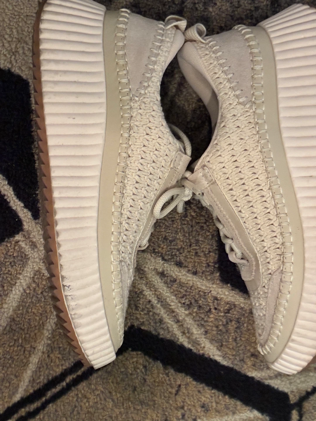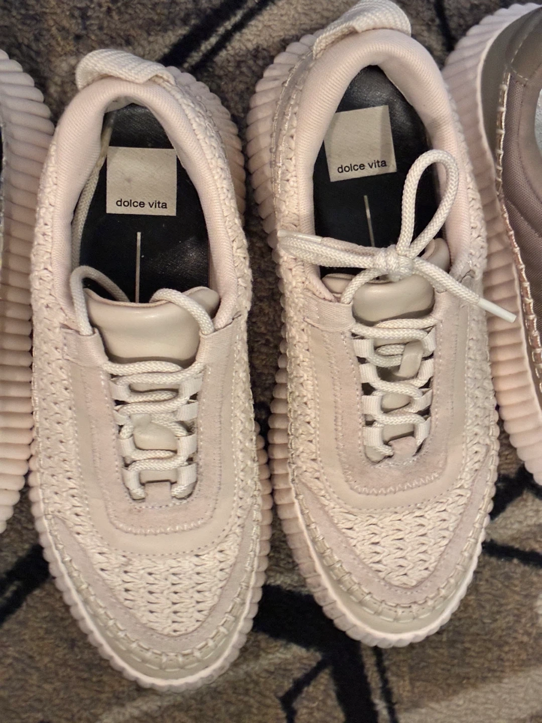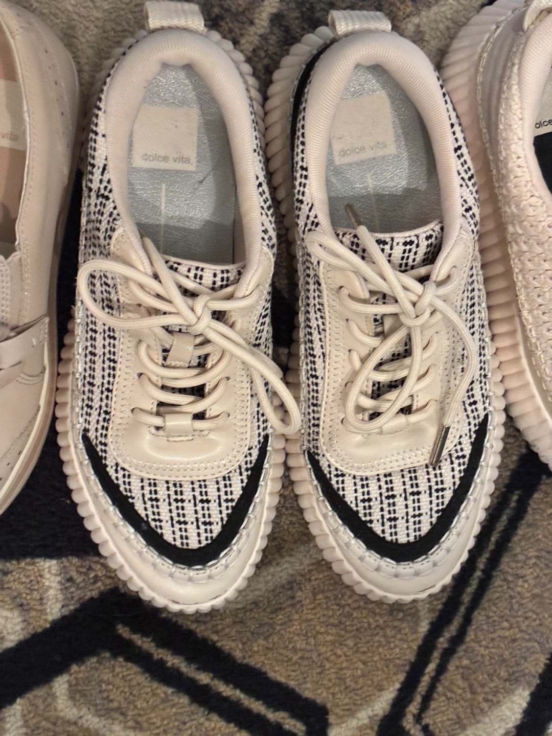 These Dolce Vita sneakers are super comfy and stylish. They feature a unique tweed-like pattern with cream and black accents and a chunky sole. Perfect for everyday wear!