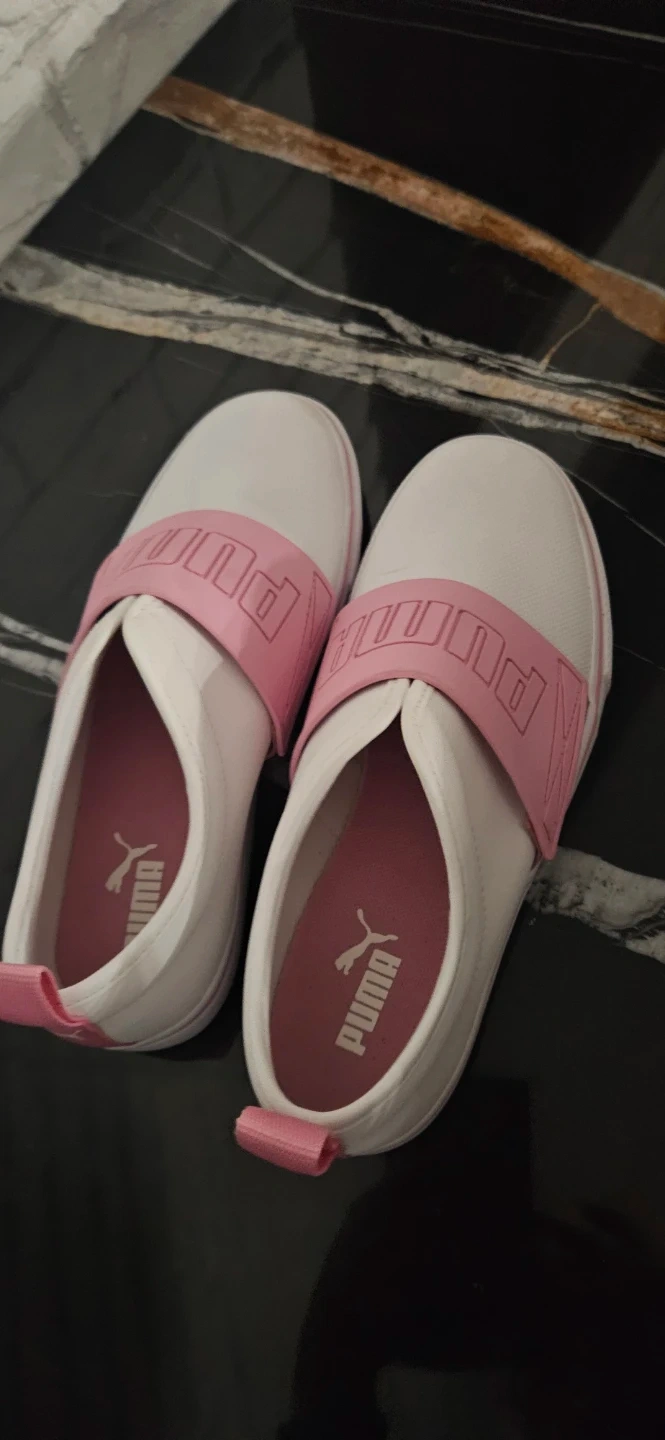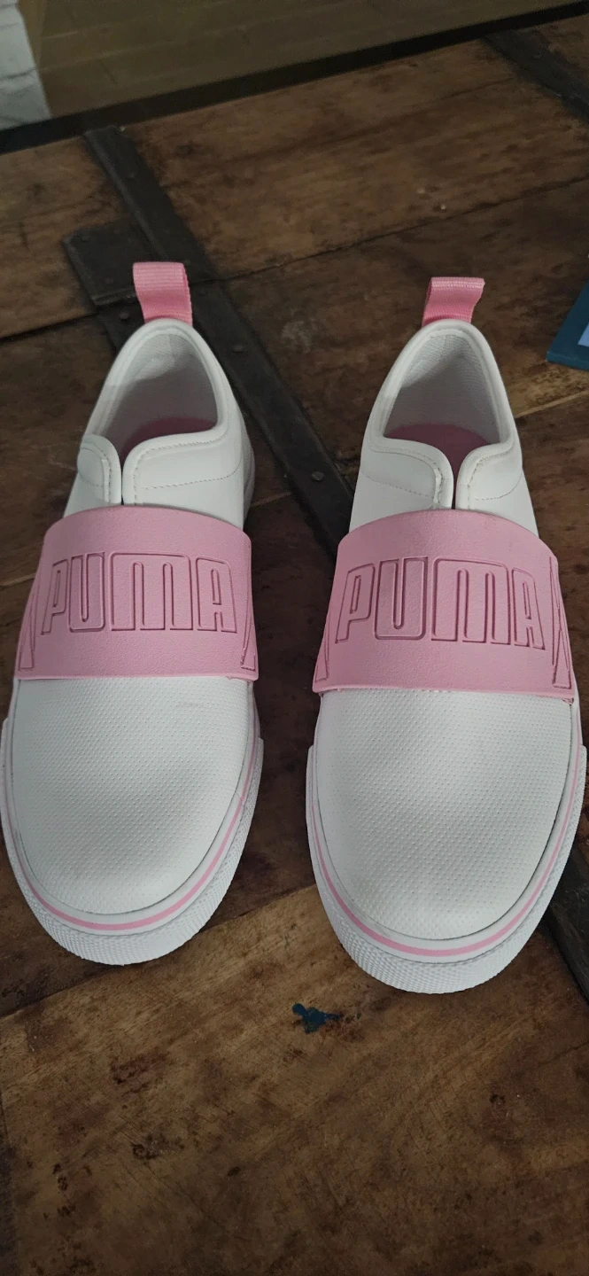 These Puma slip-on shoes are white with pink accents. They're a women's size 8 Features elasticated PUMA band across the top. Pull tab at the heel for easy on and off.