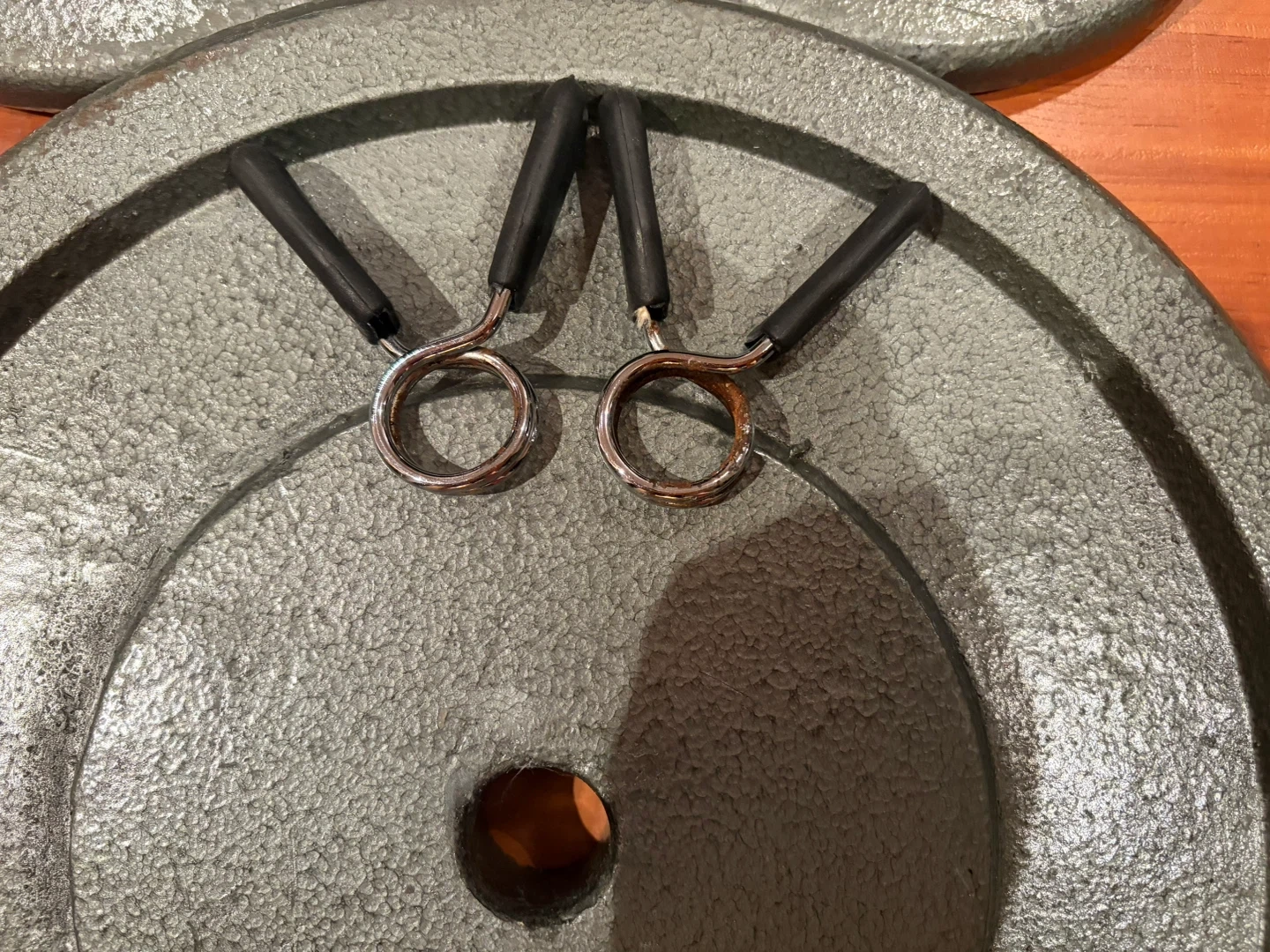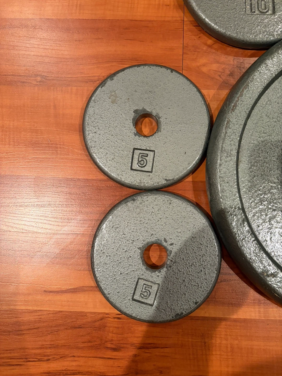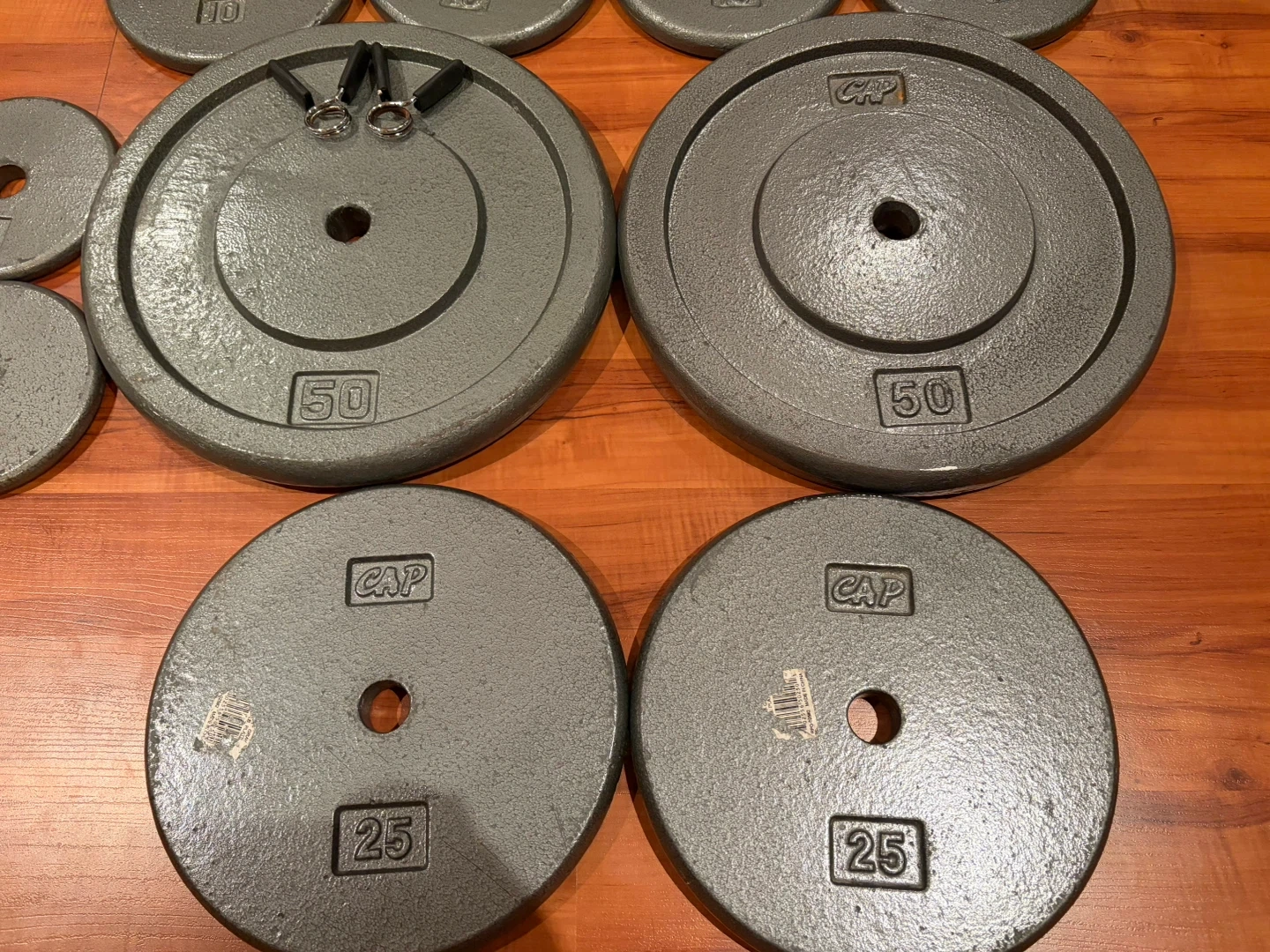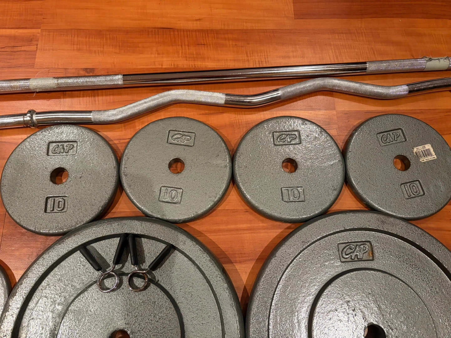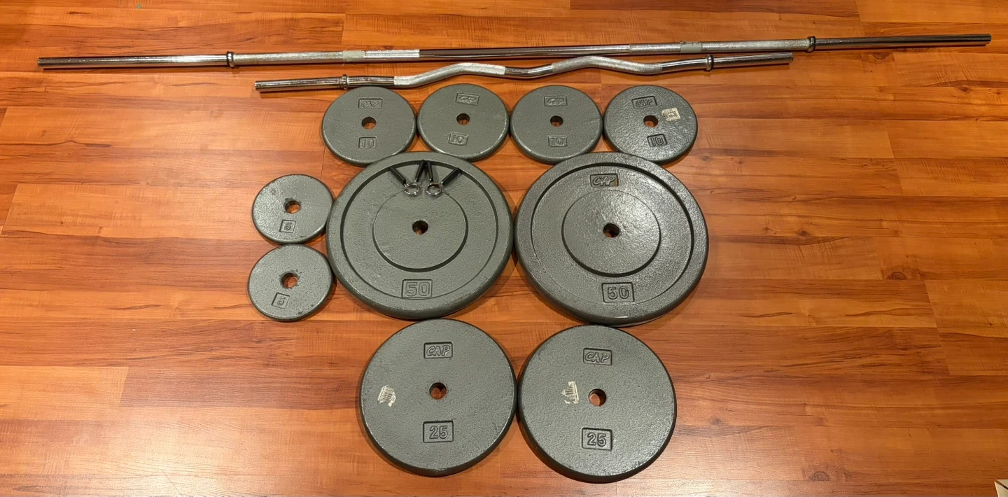 This set includes two barbells, a straight bar and an EZ curl bar. It also comes with various weight plates: two 5lb, four 10lb, two 25lb, and two 50lb plates. Two pairs of spring collars are included to secure the weights.