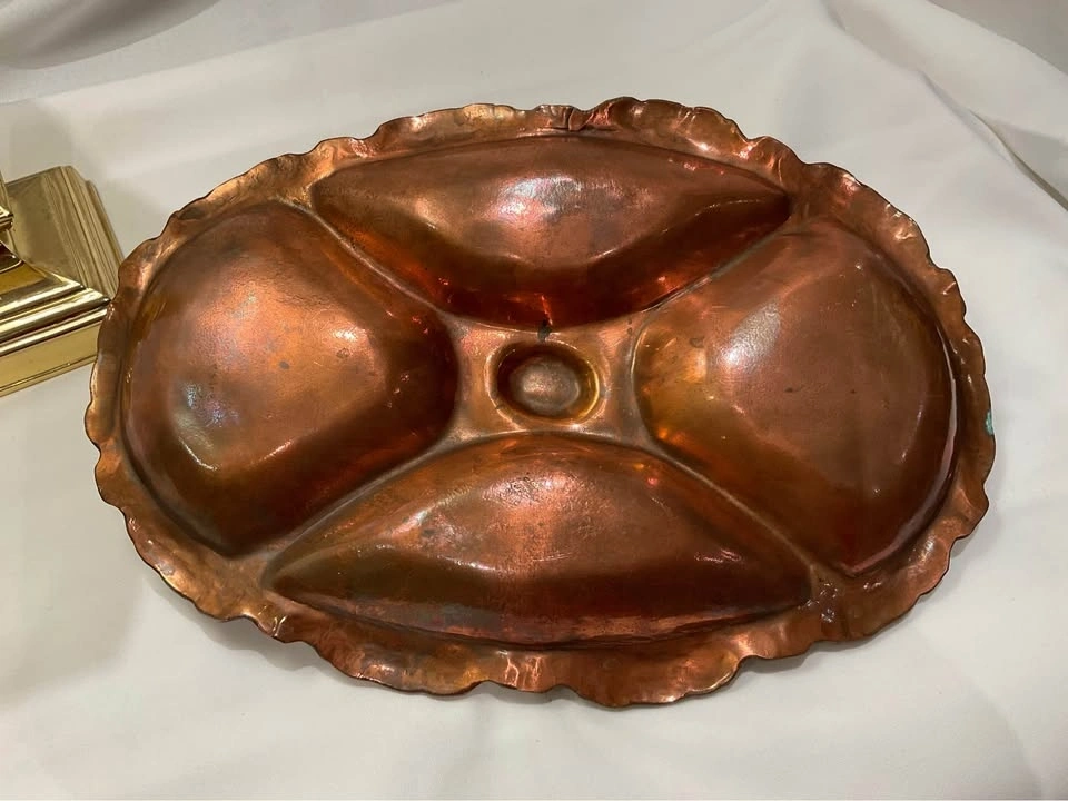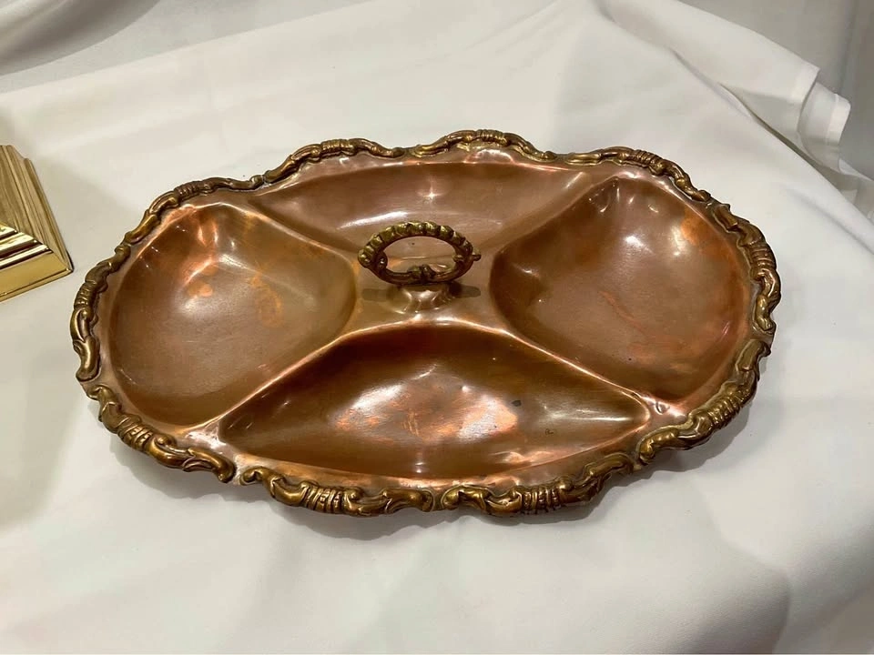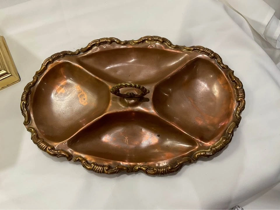 Beautiful copper divided serving dish. Has not been cleaned, this is natural patina. Has good weight to it. 14" x 10". #440/800. Cash Only - Richmond Hill - Bathurst & King Rd.