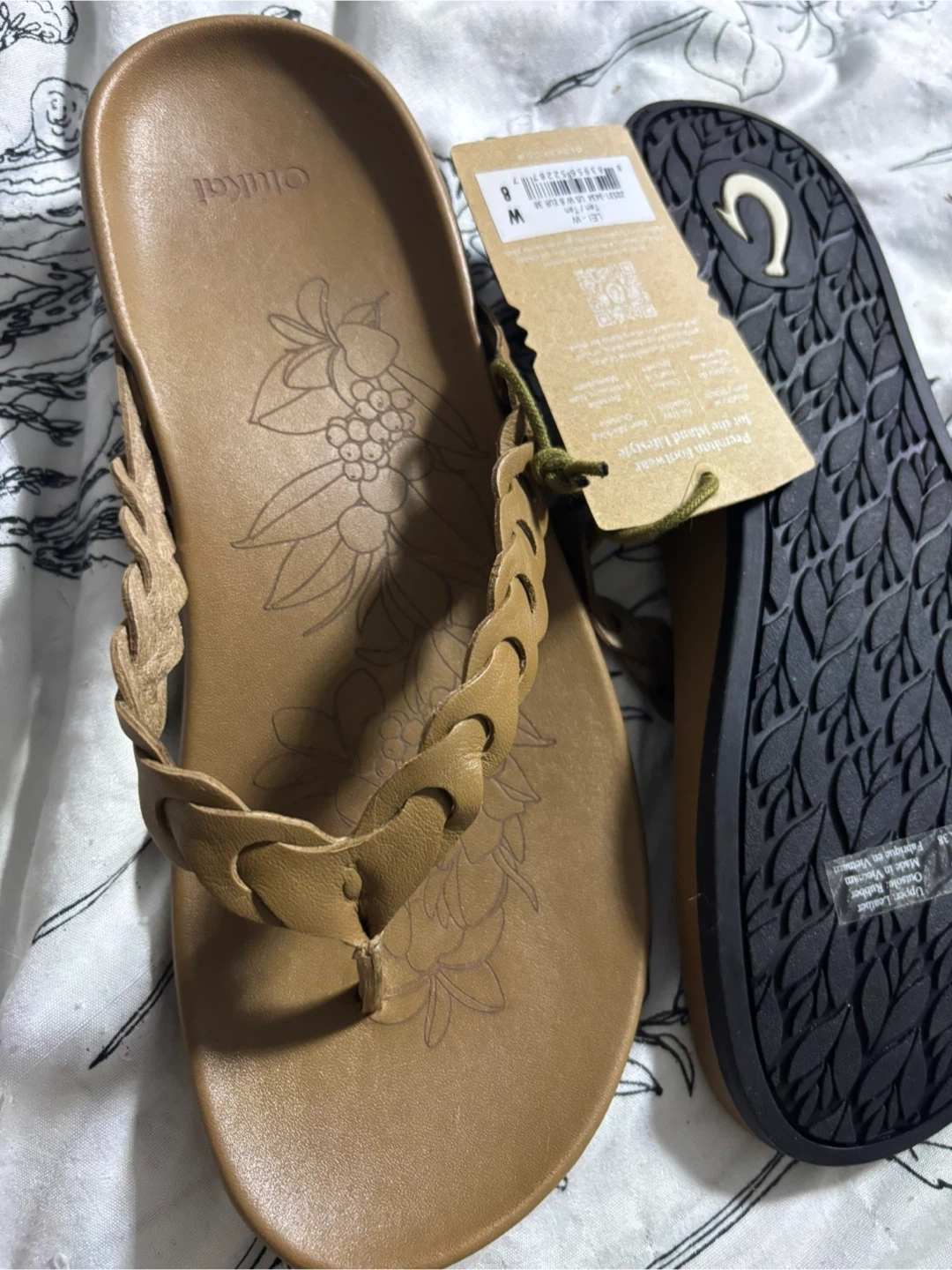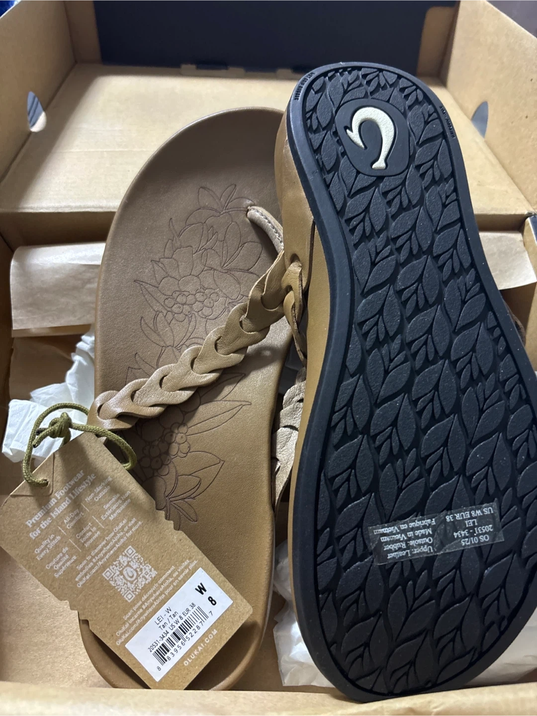 SOLD OUT ONLINE ! NEW IN BOX TAGS ON These OluKai Lei sandals are made with tan leather and feature a braided strap design. They come in a size 8. They're perfect for all day wear casual wear with super comfort PU footbed