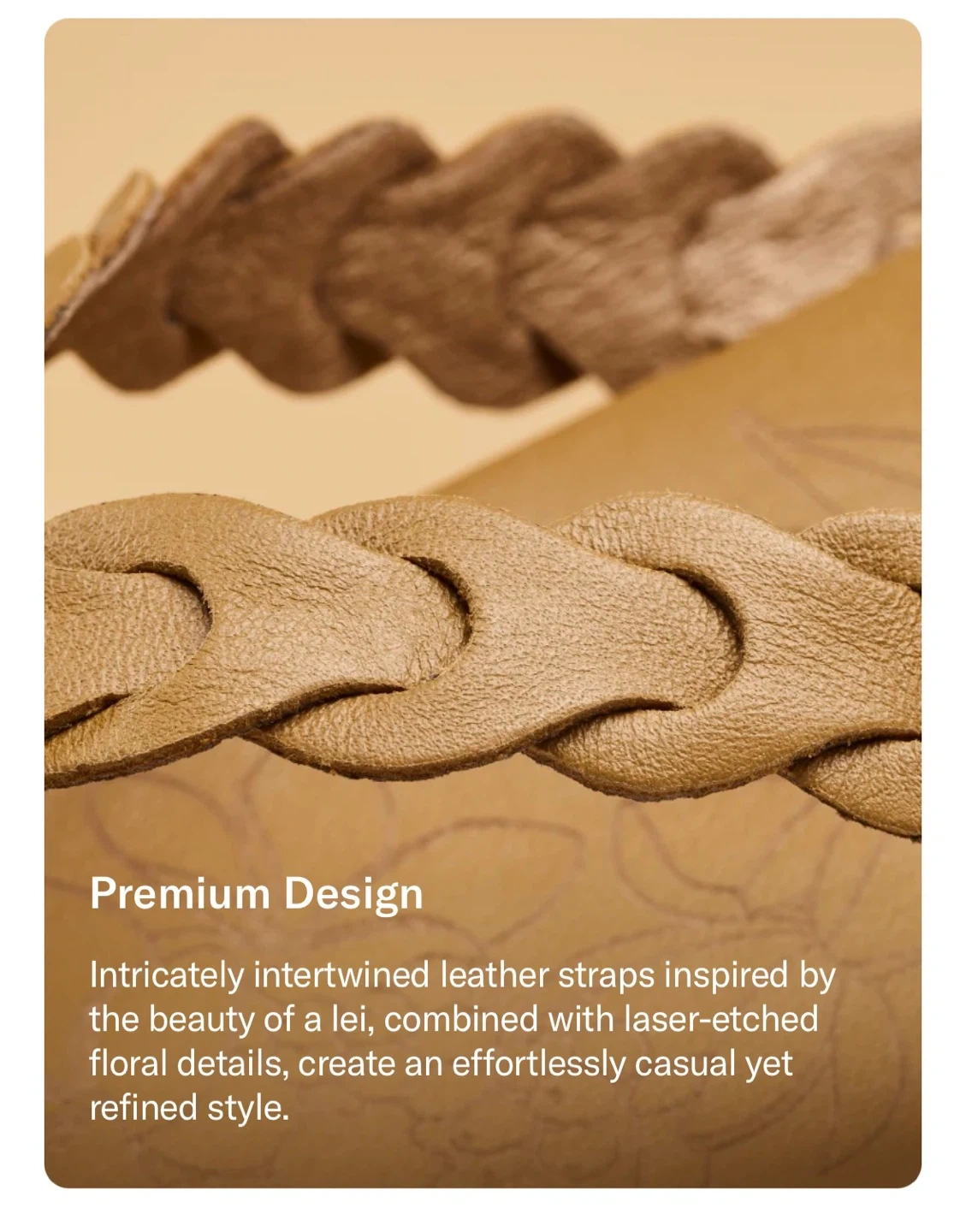 Lei-Inspired Design: Soft, interwoven leather straps mimic the beauty of a lei, bringing a touch of island-inspired sophistication to your look.