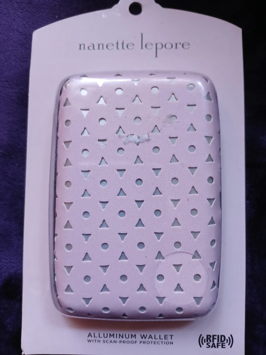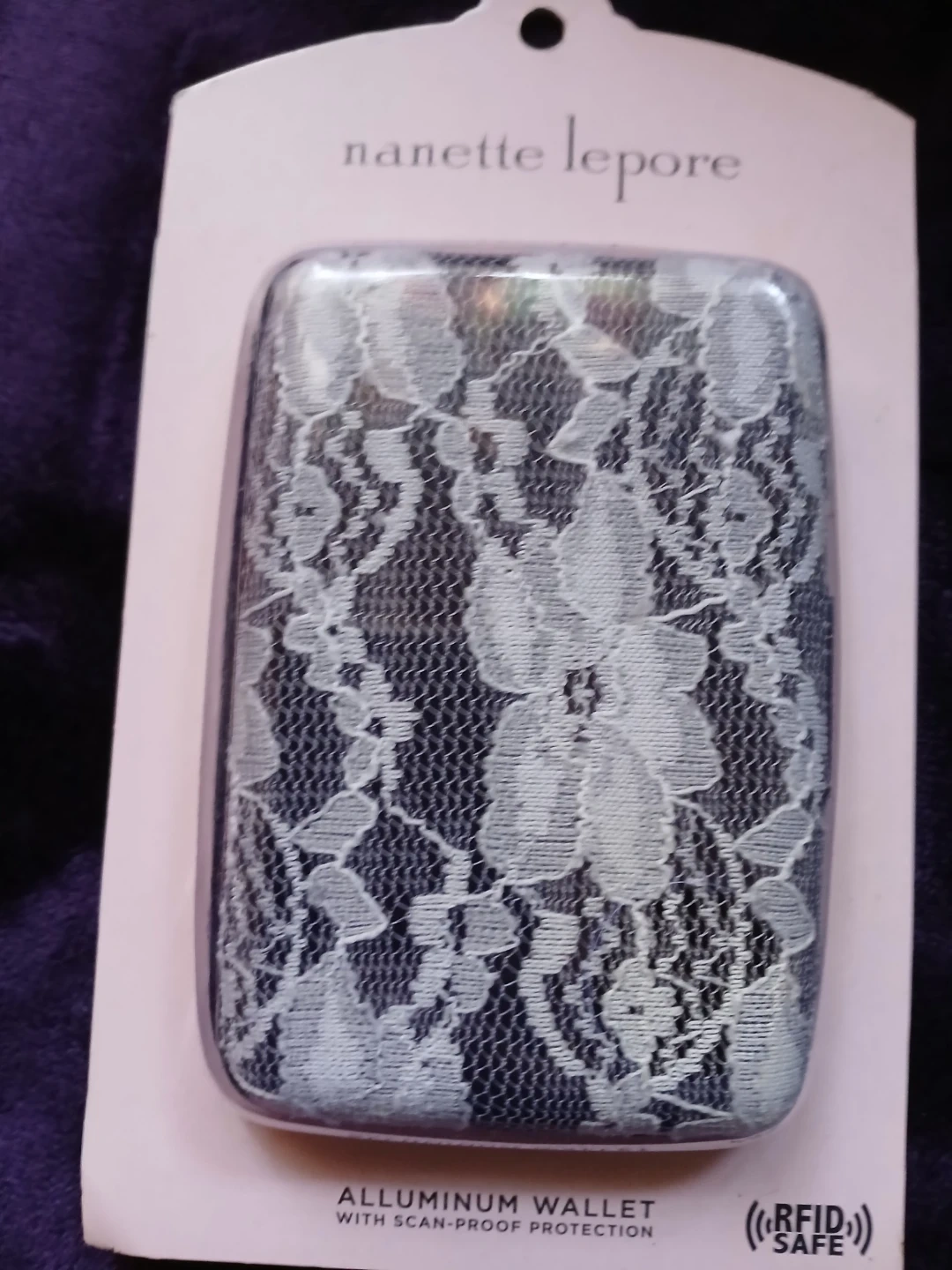 This Nanette Lepore aluminum wallet offers RFID scan-proof protection for your credit cards and debit cards. It's designed to prevent electronic scanning by thieves. The wallet features a stylish floral lace overlay on a metallic finish. Comes in white lace or pink colour's @ $10 each