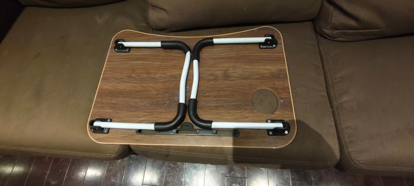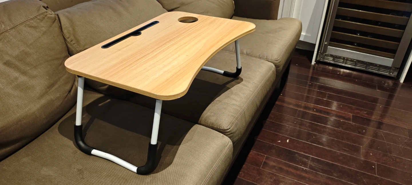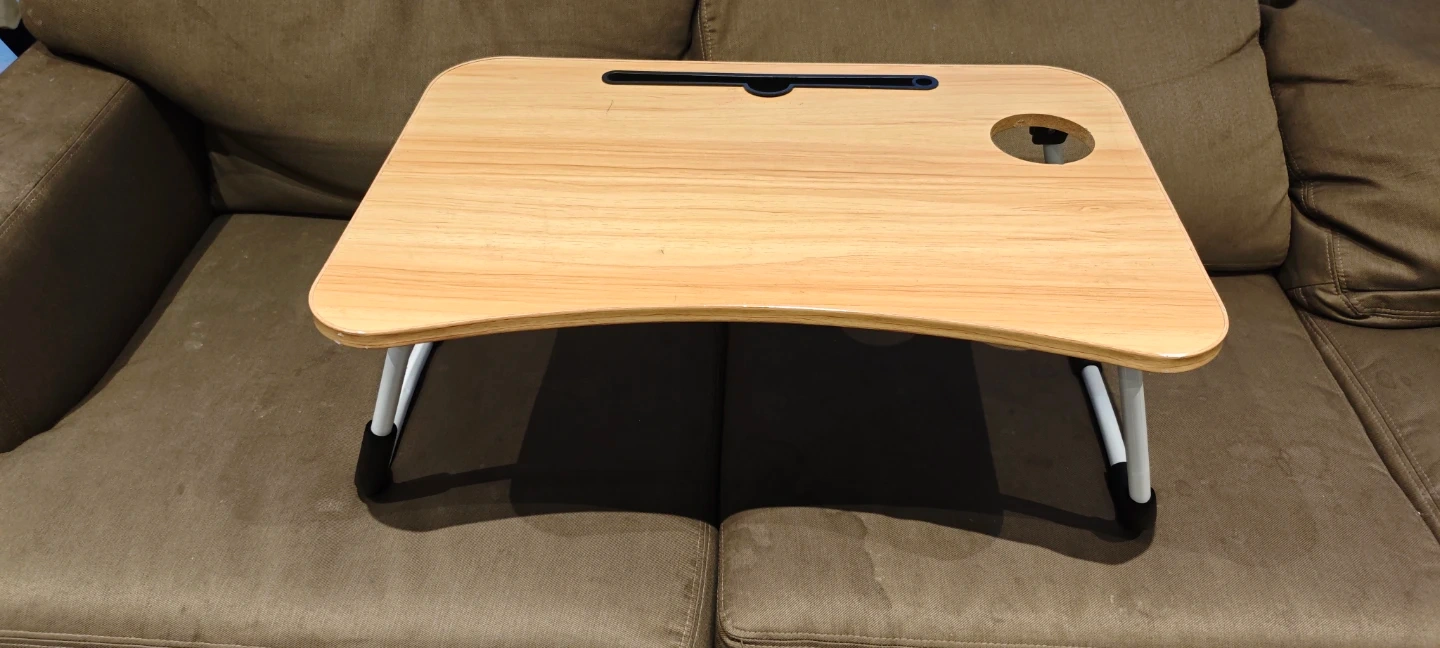 Selling a foldable laptop bed desk. It's super handy for working or relaxing in bed or on the couch. It features a cup holder and a slot for your tablet or phone. The legs fold easily for storage, making it lightweight and portable