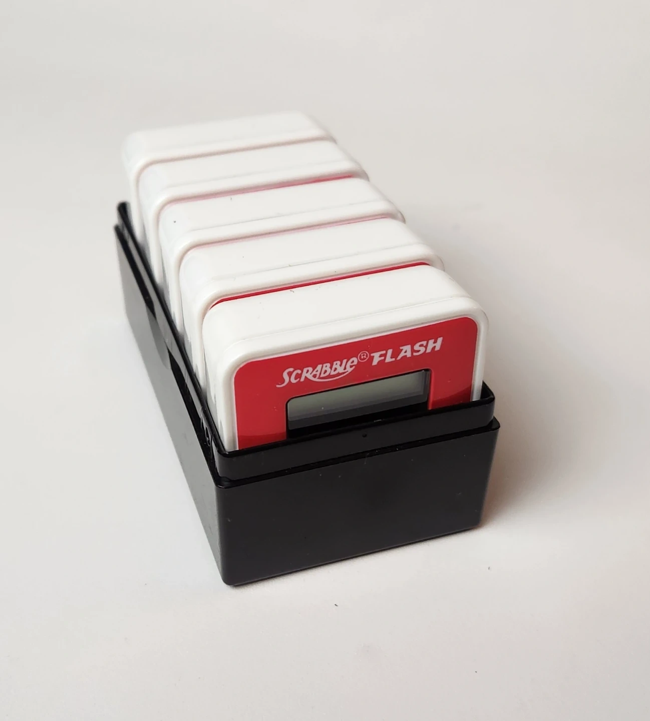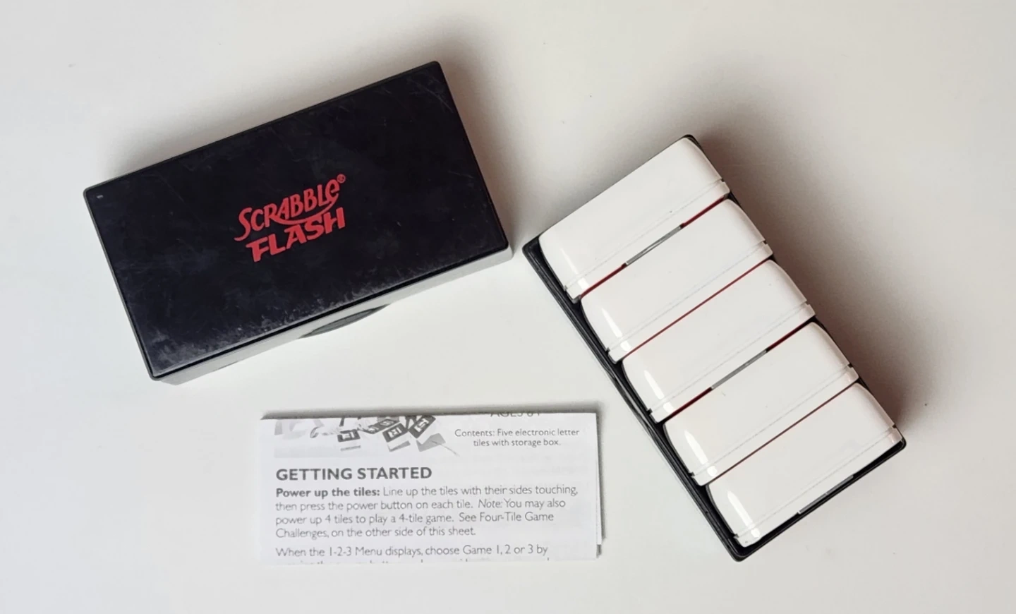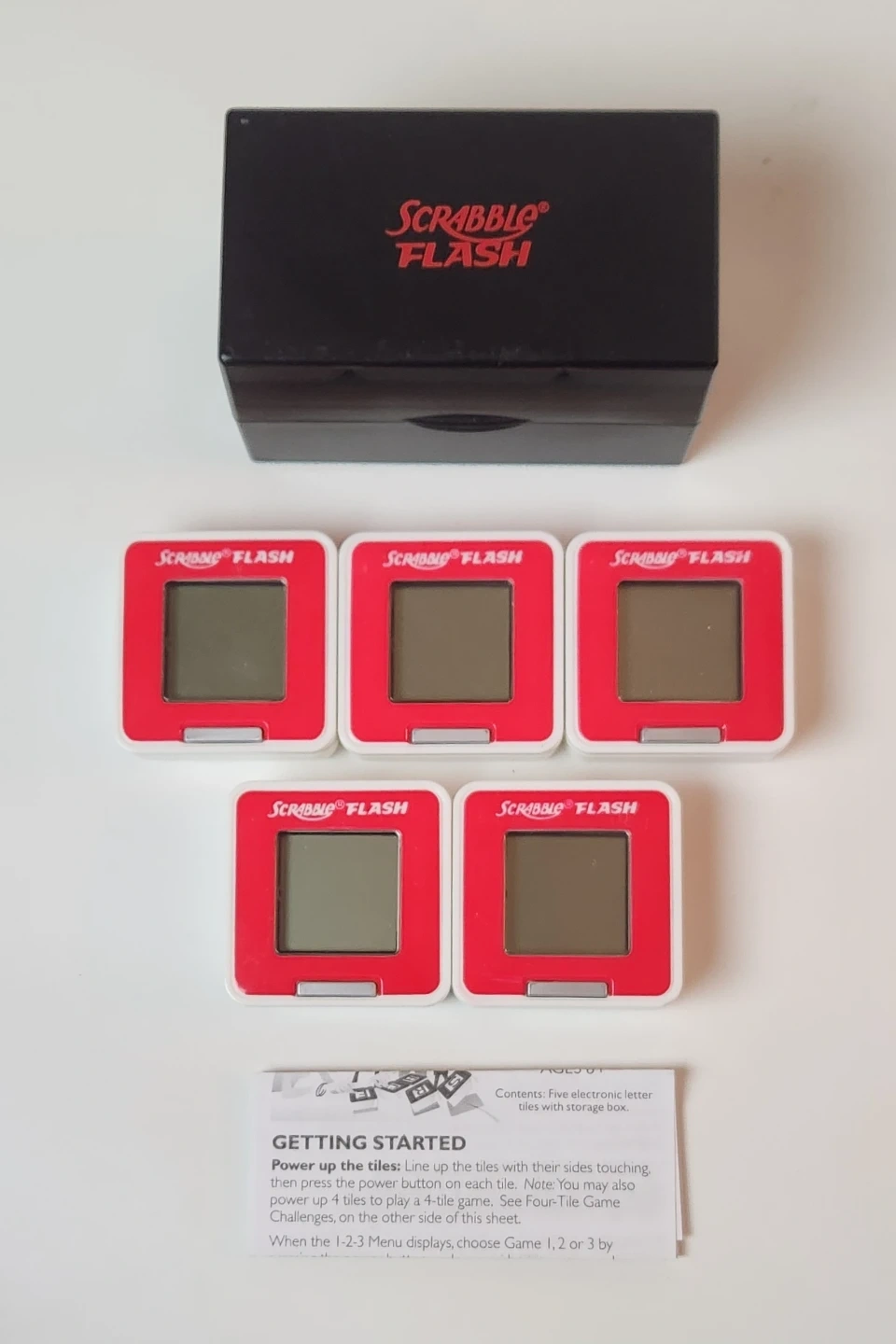 Scrabble Flash is an electronic, fast-paced word game where players use five interactive, light-up tiles to form as many words as possible within a 60-second time limit. The tiles use "SmartLink" technology to instantly recognize words, beep to confirm, and track scores, allowing for solo or competitive, high-speed play.