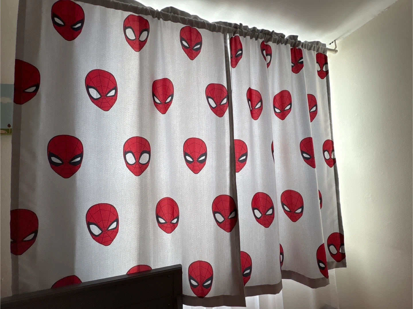 Set of two curtains featuring a classic Spider-Man mask pattern. Adds a fun, superhero touch to any room. Grey trim along the top and sides.