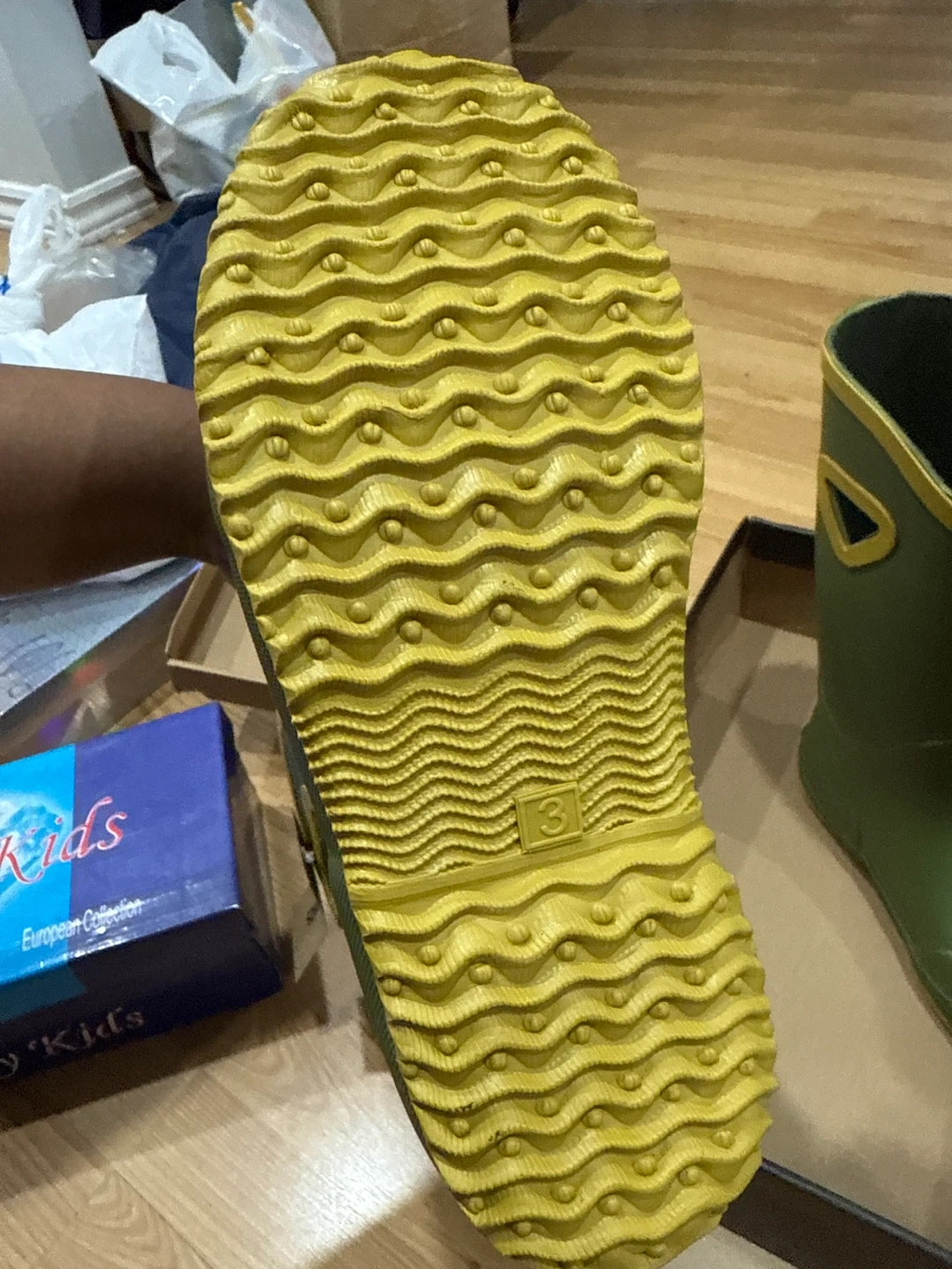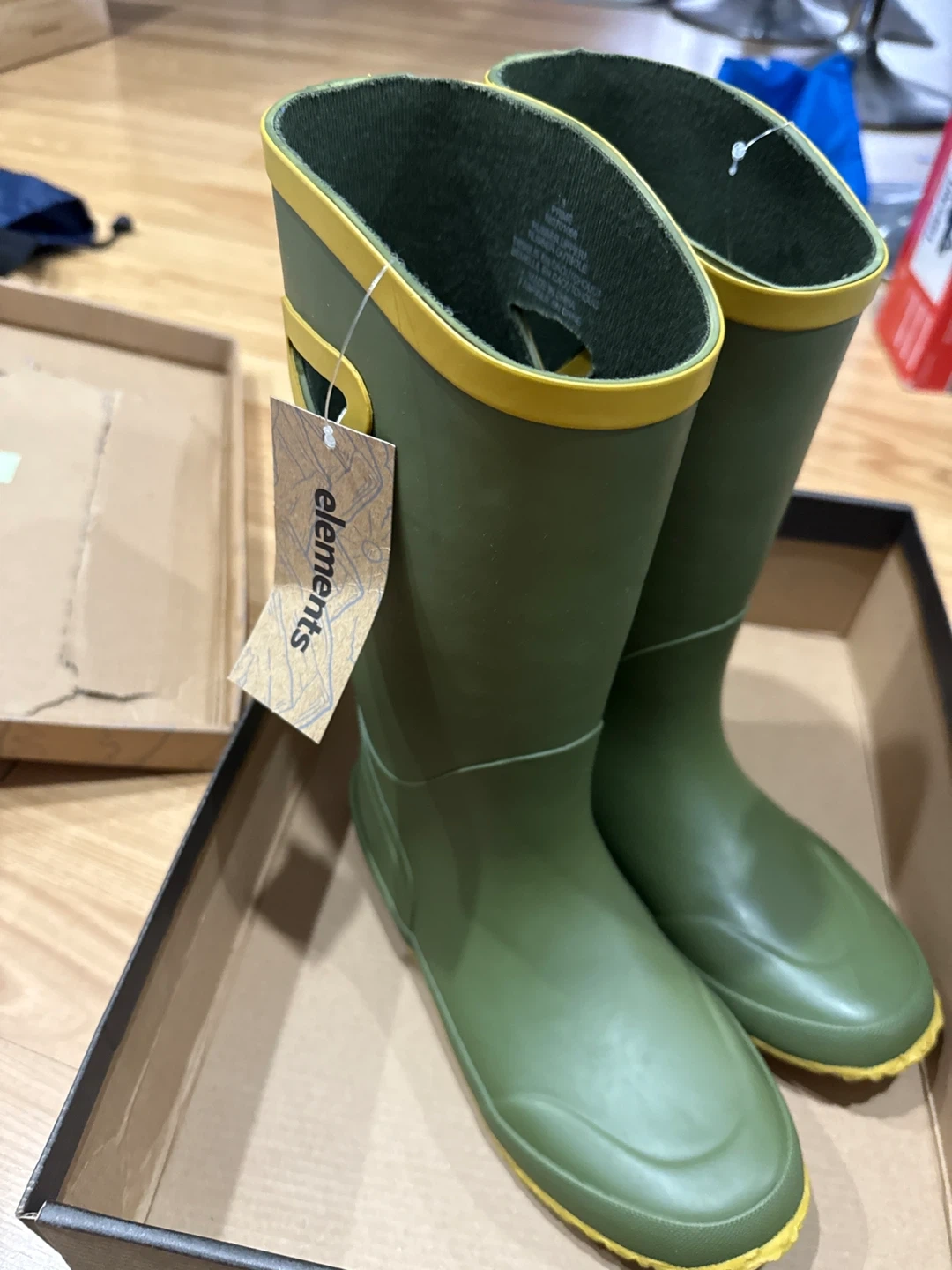Elements green rubber rain boots with yellow trim. Features a deep tread sole for good grip. Size is 3.new with tags and box