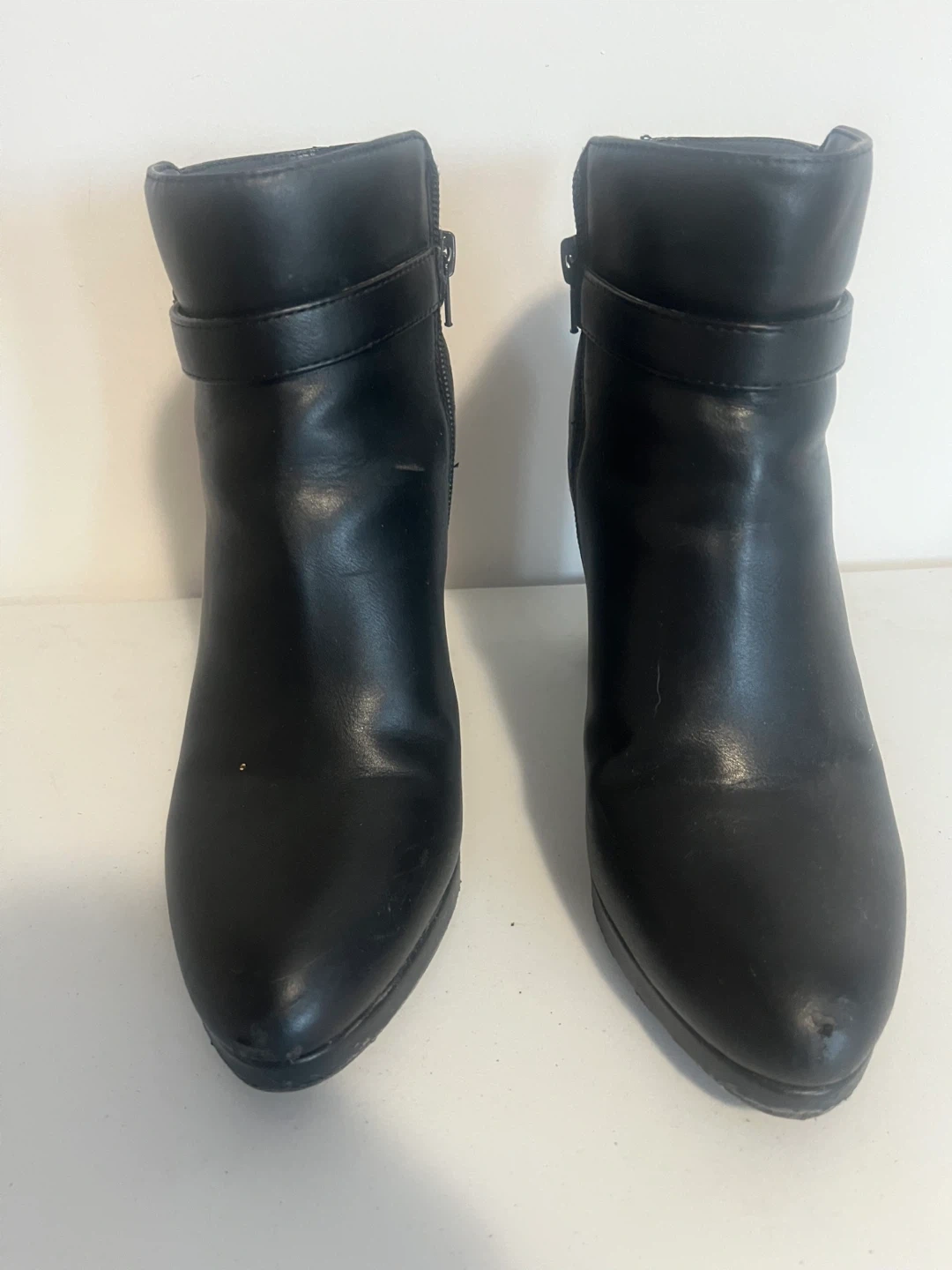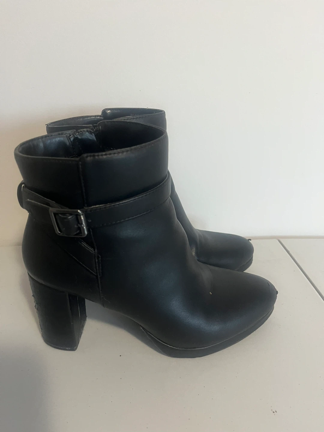 Black ankle boots by Kelly & Katie. They feature a side zipper and decorative buckle strap. These boots have a block heel and faux leather upper. Perfect for dressing up any outfit!