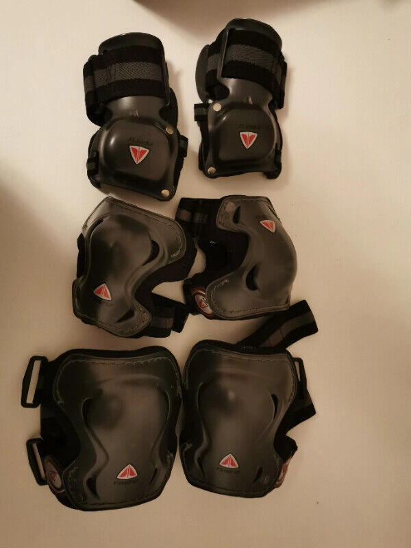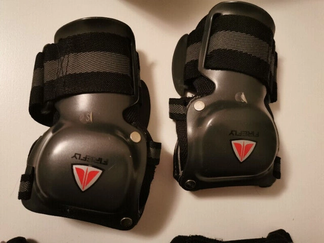 Used - Like new. This is a 6-piece set of Firefly Sportline protective gear, including knee pads, elbow pads, and wrist guards. They are suitable for various sports like cycling, rollerblading, and skateboarding. The gear is black/gray and features adjustable straps for a comfortable fit.