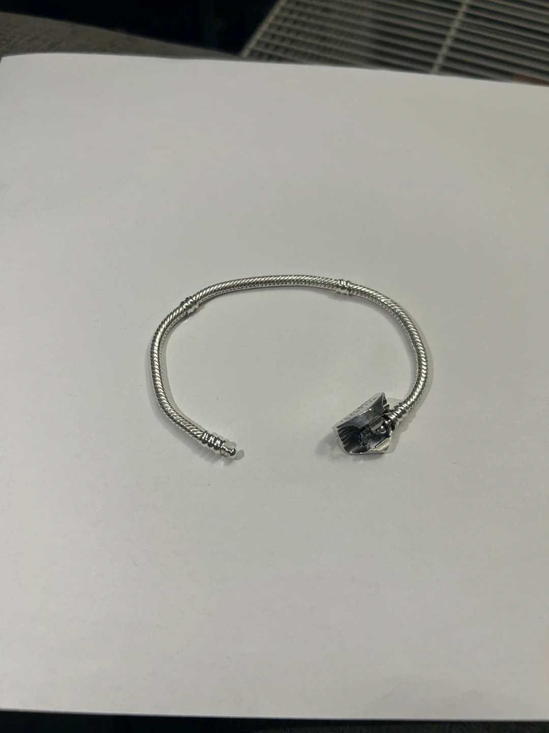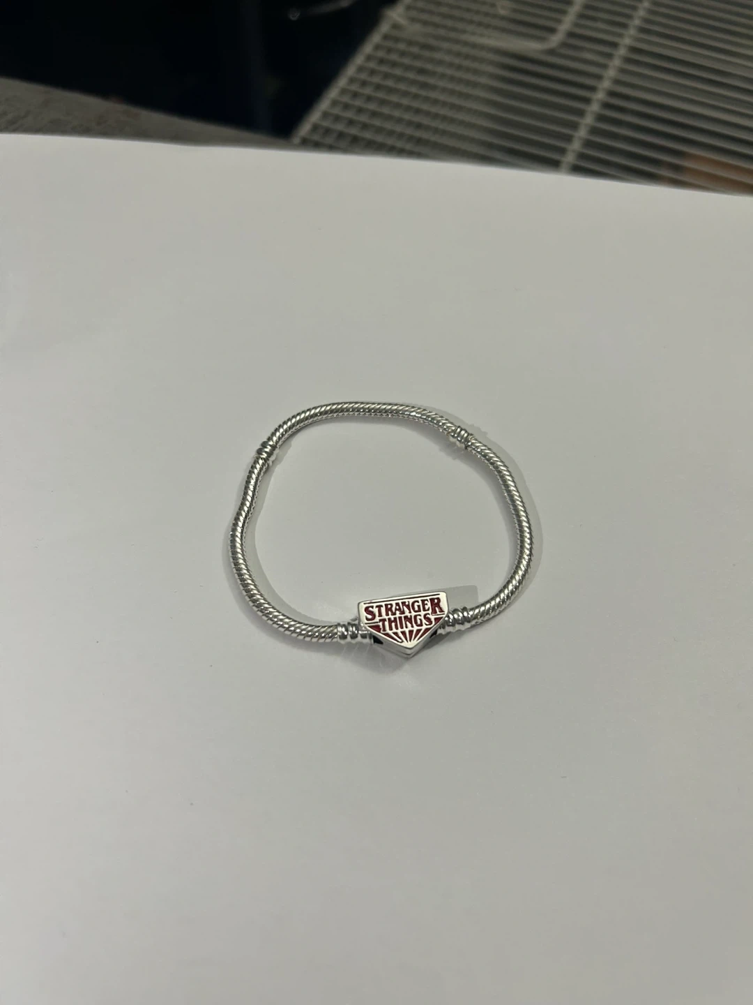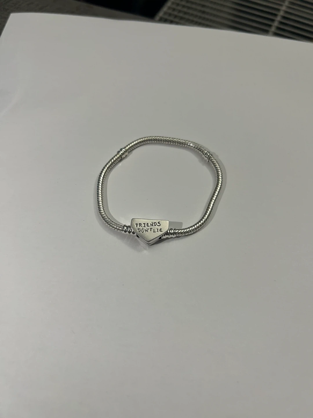 Sterling silver bracelet with a Stranger Things themed clasp REP. Includes Pandora box. This bracelet's clasp reads 'Friends Don't Lie' and has the Stranger Things logo. Great for fans of the show!