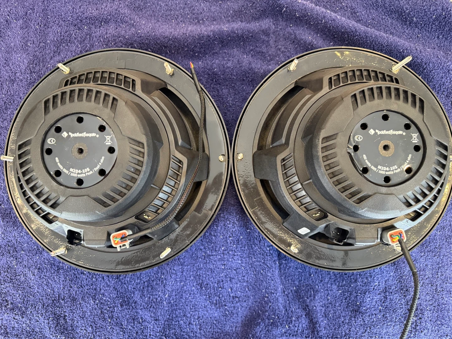 Selling a pair of Rockford Fosgate M2D4-10S 10-inch marine subwoofers. These are designed for marine environments. They're 4-ohm voice coil speakers.