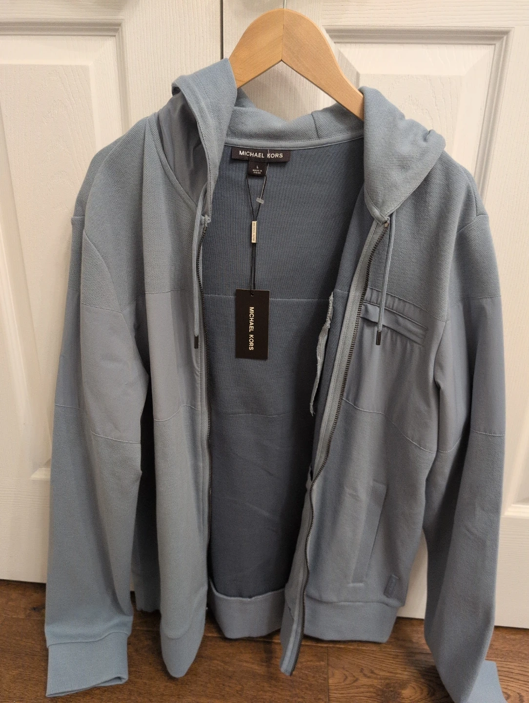 This is a Michael Kors zip-up hoodie in a light blue colour. It's a size large and appears to be made from a textured knit material. It features a full zip closure and a hood.