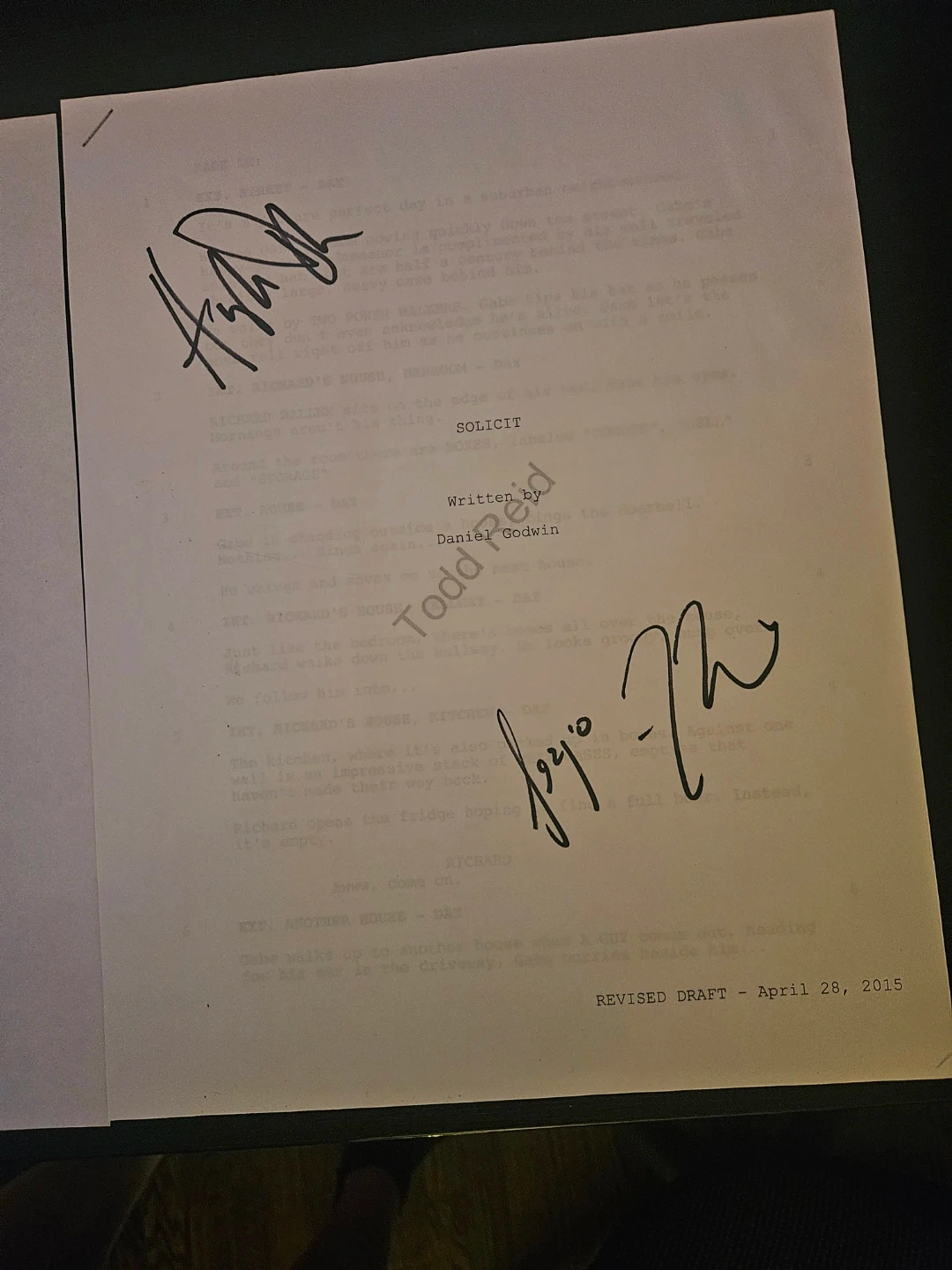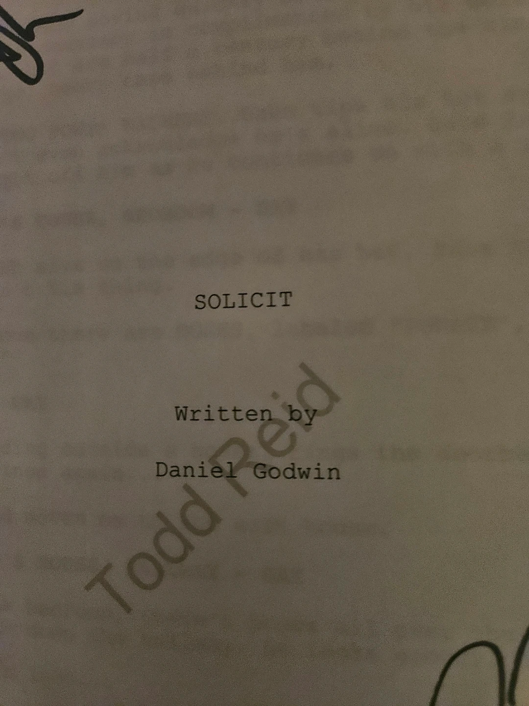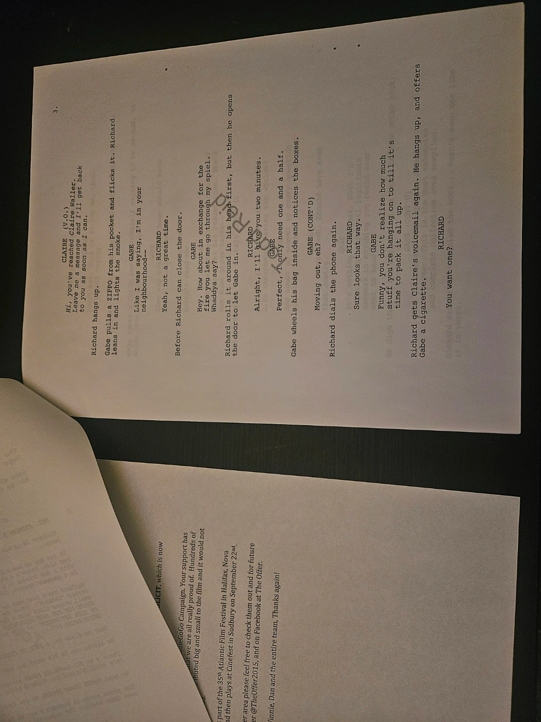 Script for the short film SOLICIT which became THE OFFER. Written by Daniel Godwin. Dated April 28, 2015. The film premiered as part of the 35th Atlantic Film Festival. It also played at Cinefest in Sudbury.