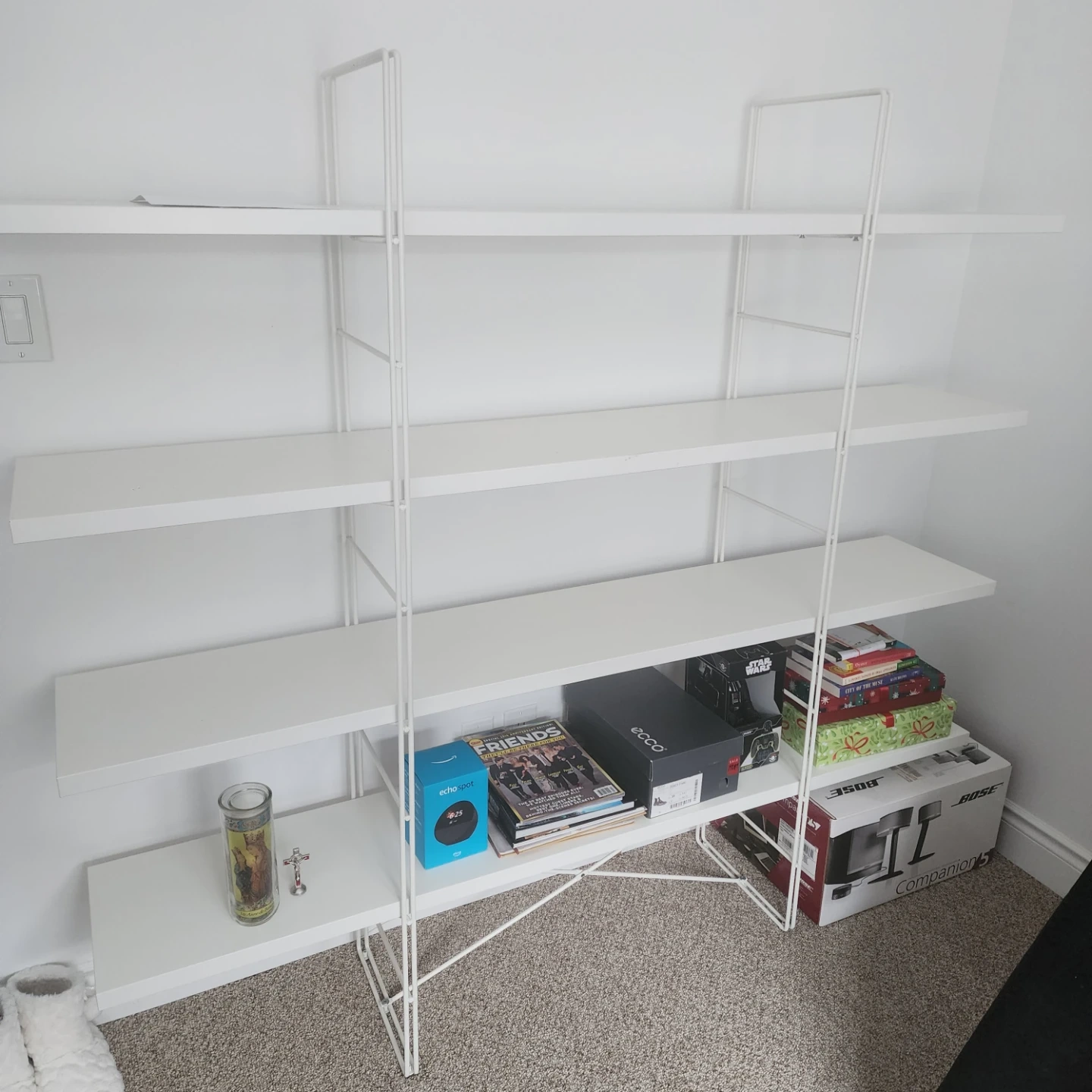This is a white metal wall shelf unit with multiple shelves. It's a sturdy piece for organizing books and decor. Its minimalist design fits well in various rooms.
