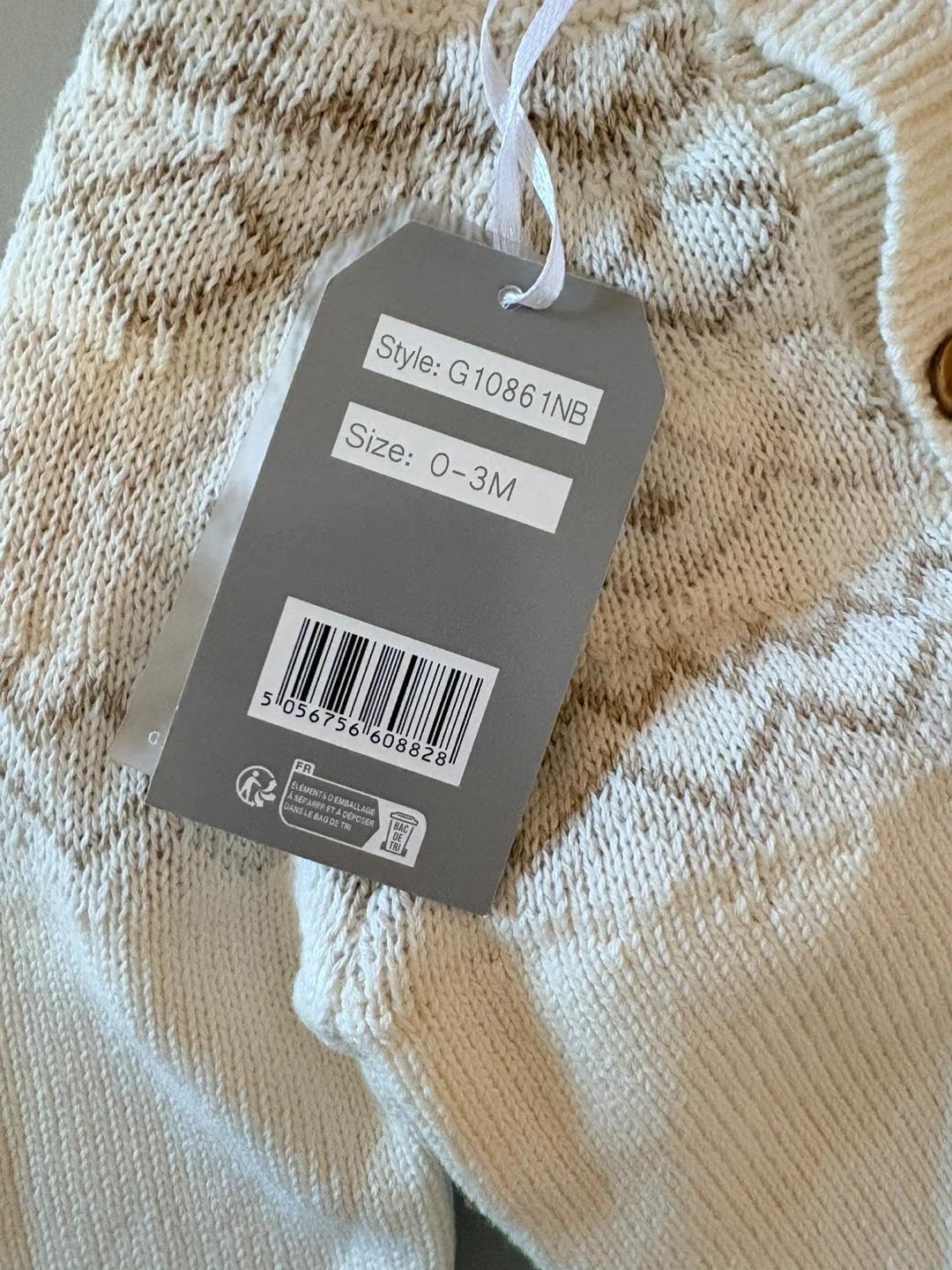 Cream and tan fair isle knit cardigan and footed pants set. Features wooden button closure on cardigan. This set is size 0-3 months.