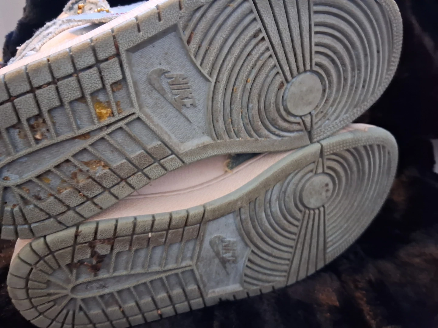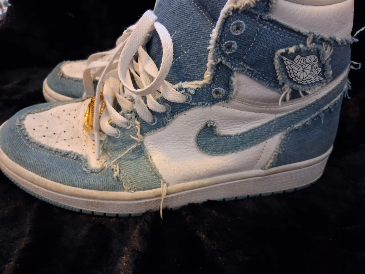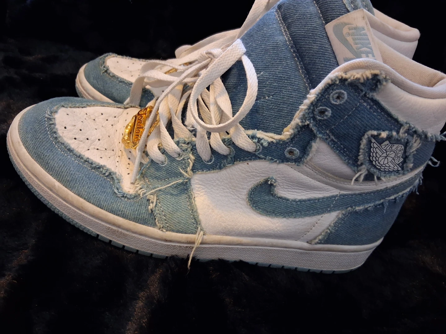 These Nike Air Jordan 1 High sneakers feature a denim and white colorway. They've got white laces and gold "Jordan" lace charms. The iconic Air Jordan Wings logo is visible on the side.