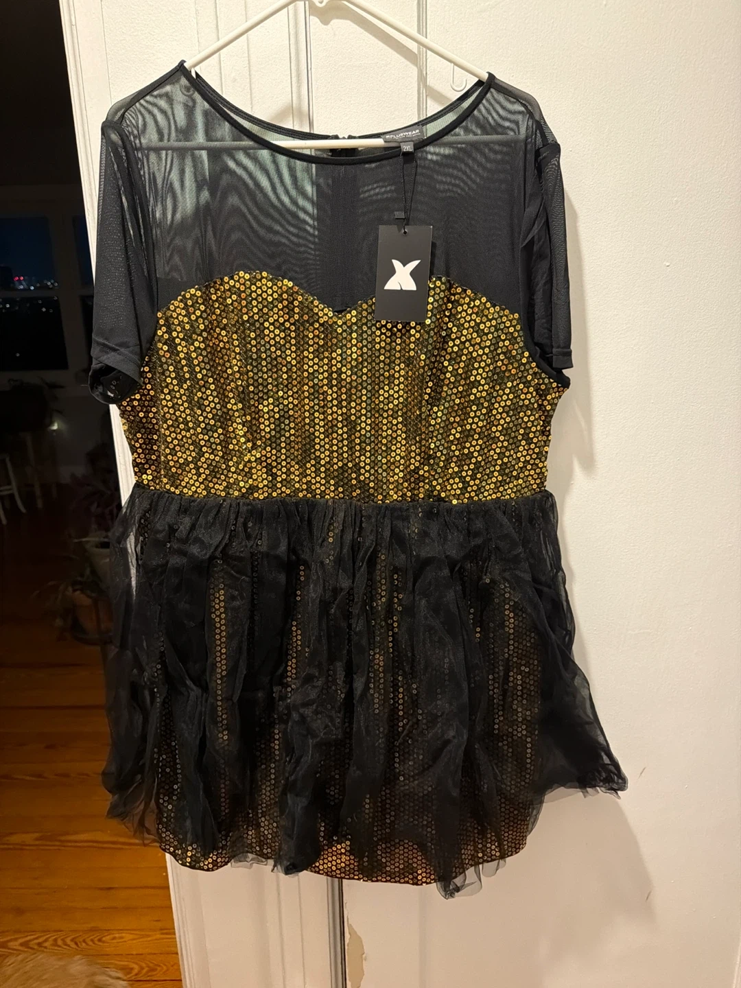 Selling a beautiful RLLUWEAR dress in size 2XL! It features a striking combination of black mesh and gold sequins, perfect for a night out or special occasion. The dress has a unique design with a ruffled hem and a flattering fit. It's in great condition and ready to wear!