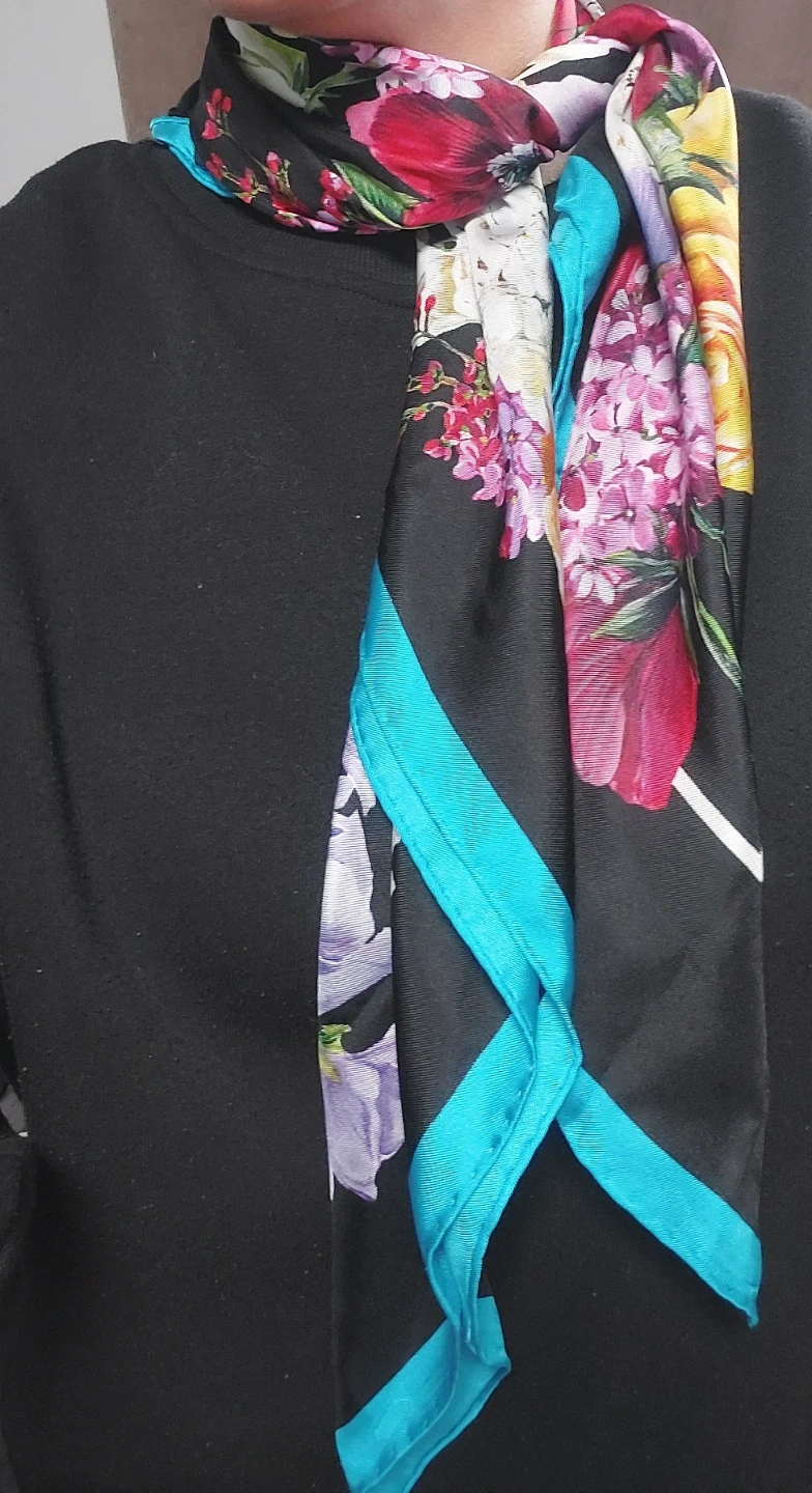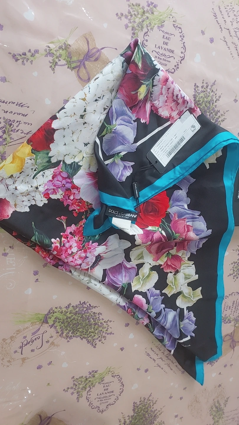 This Dolce & Gabbana scarf features a vibrant floral print with a turquoise border. It's made from silk and comes in its original box. It's a beautiful accessory for any outfit!