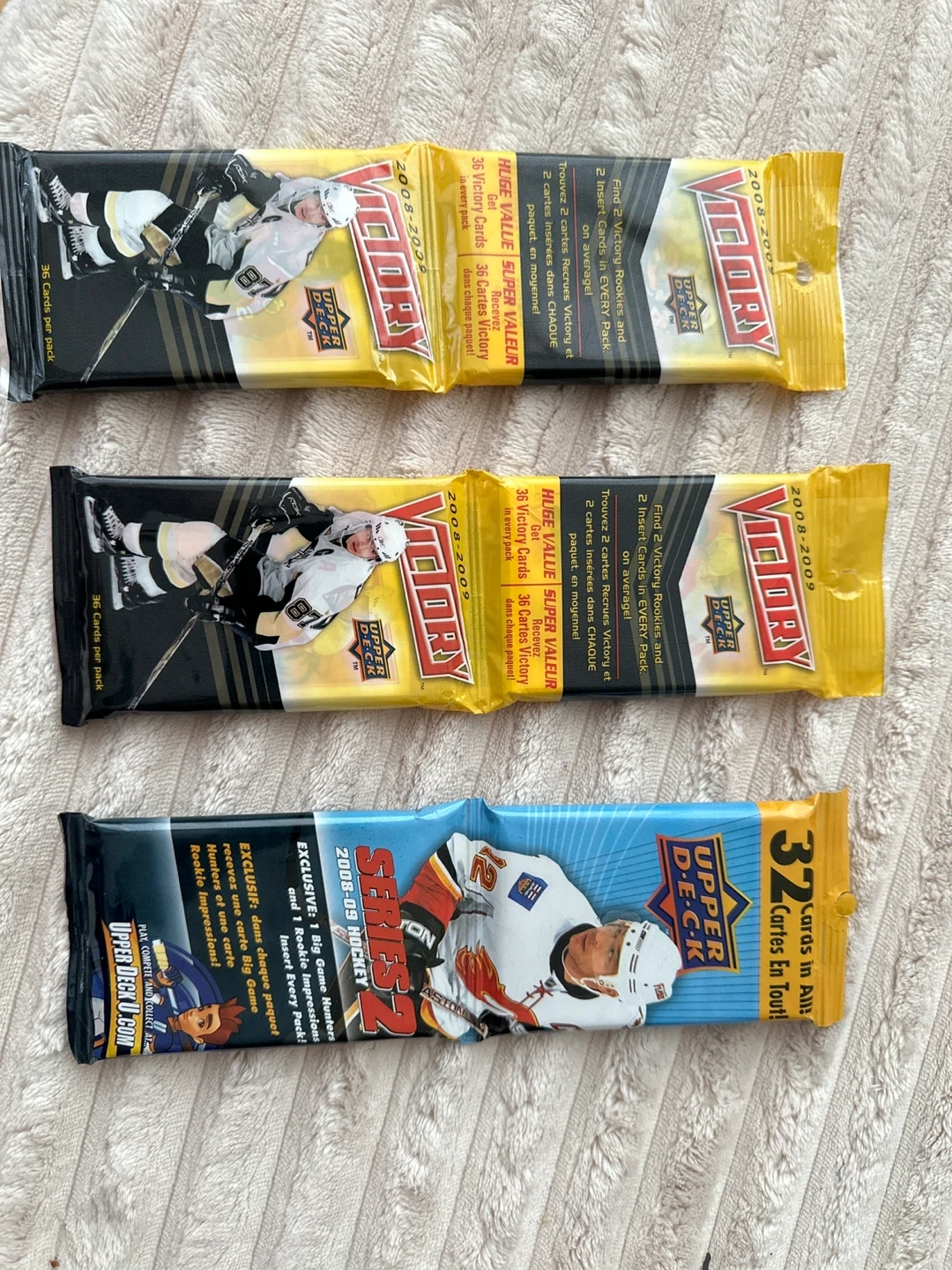 Forgot I had these packs saved, not a clue if they are worth much and I’m asking anyone for help if you have knowledge please send me messages thank you so much !!Three packs of Upper Deck hockey cards from the 2008-09 season. Includes two packs of Victory with 36 cards each and one pack of Series 2 with 32 cards. Find rookies and inserts!