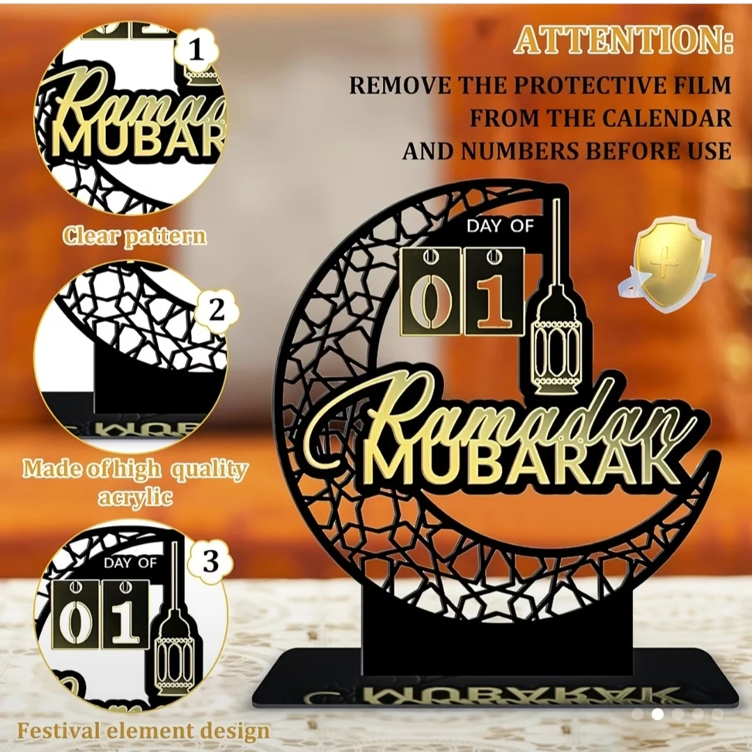 This Ramadan Mubarak countdown calendar features a moon design. It's made of high-quality acrylic with a clear pattern. The calendar comes with numbers to mark each day. Great for holiday decoration!