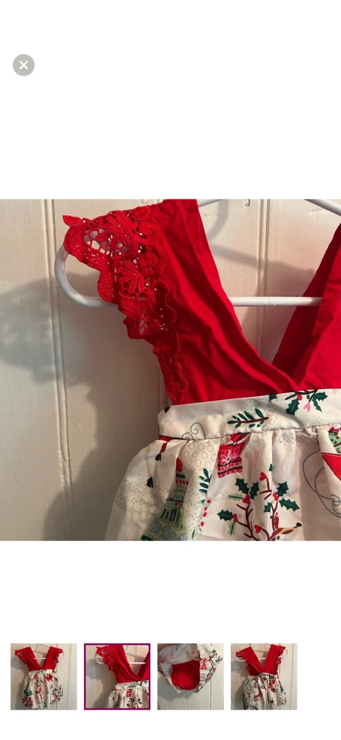 Small shop. Lace sleeve dress, romper bummies under skirt. Red with Christmas print skirt. Size 6/9m. Brand new condition