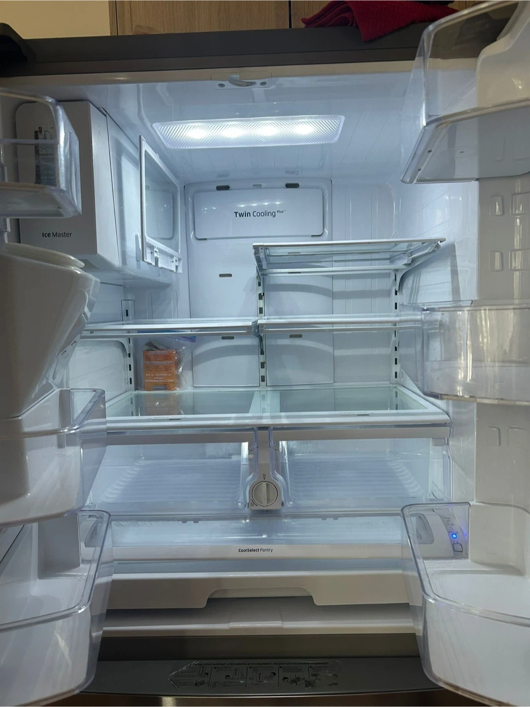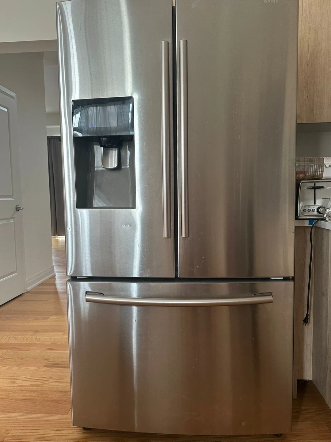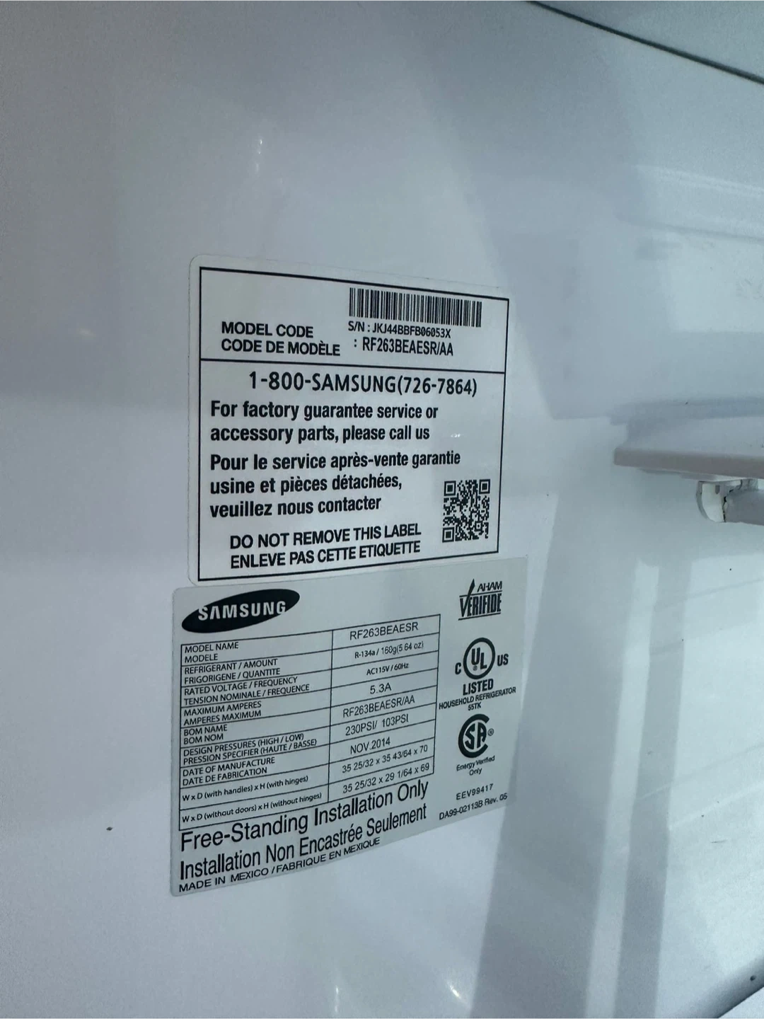 This Samsung refrigerator features a French door design and stainless steel finish. It includes the Twin Cooling Plus system for optimal temperature and humidity control. The dimensions are 35 25/32" W x 35 43/64" D x 70" H.