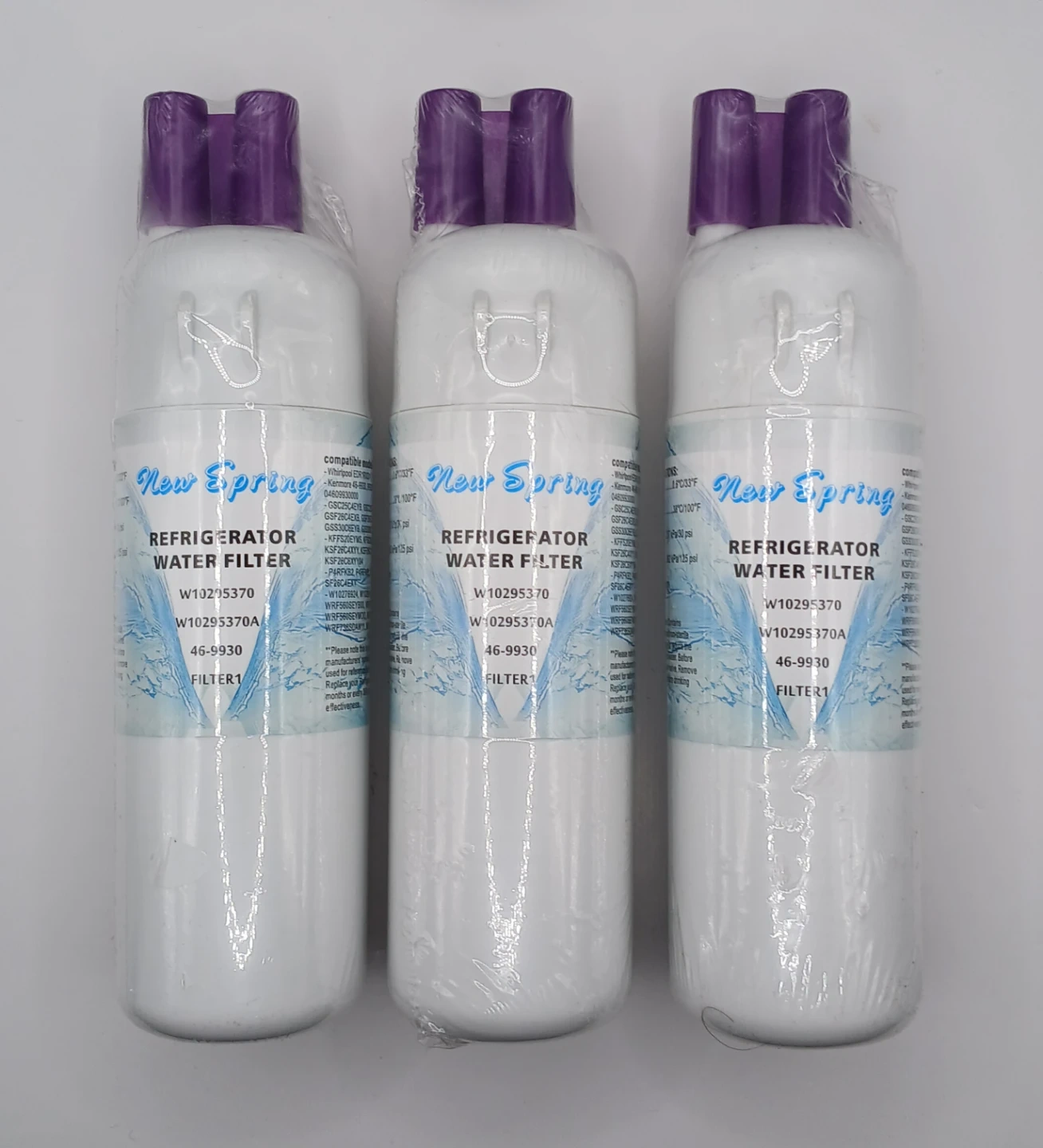 This is a 3-pack of New Spring refrigerator water filters. These filters are compatible with various Whirlpool and Kenmore models, including W10295370. They're designed to replace filter part number 46-9930. This pack provides a convenient supply for your refrigerator.