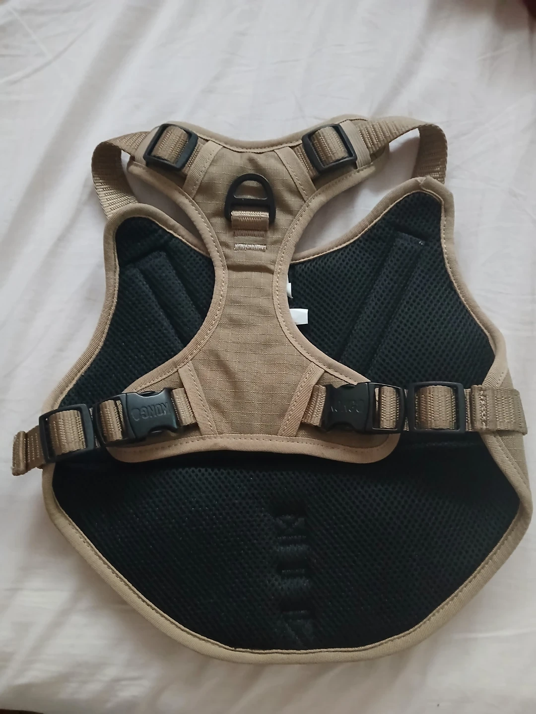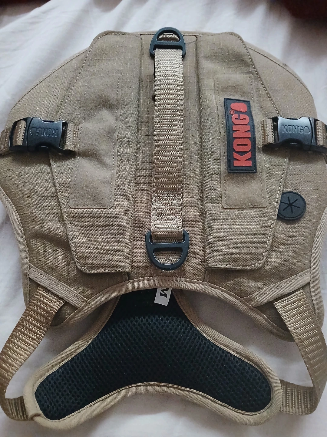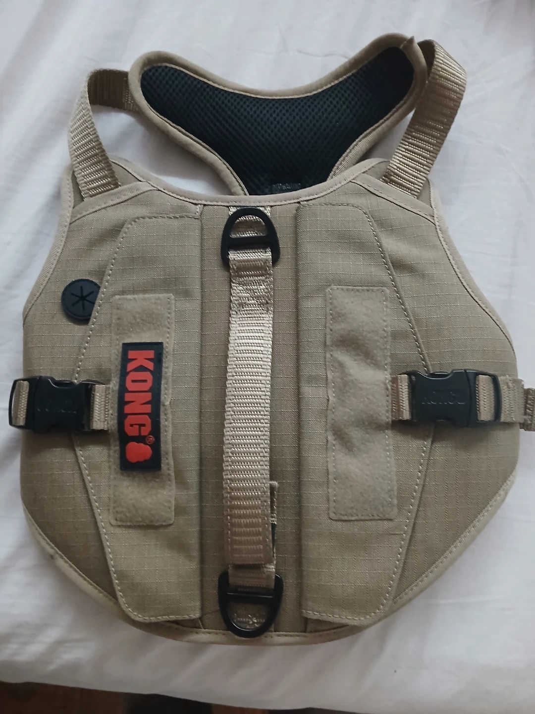 KONG brand dog harness in tan. Features adjustable straps and a padded chest area for comfort. Size medium. Also have a large.And a black one as well in large