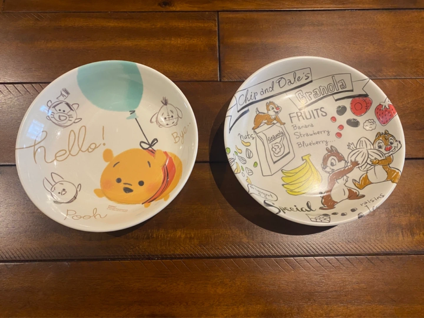 Two plates featuring Winnie the Pooh and Chip 'n' Dale characters. One plate has a 'hello!' design with Pooh and friends, while the other showcases Chip 'n' Dale with granola and fruits.