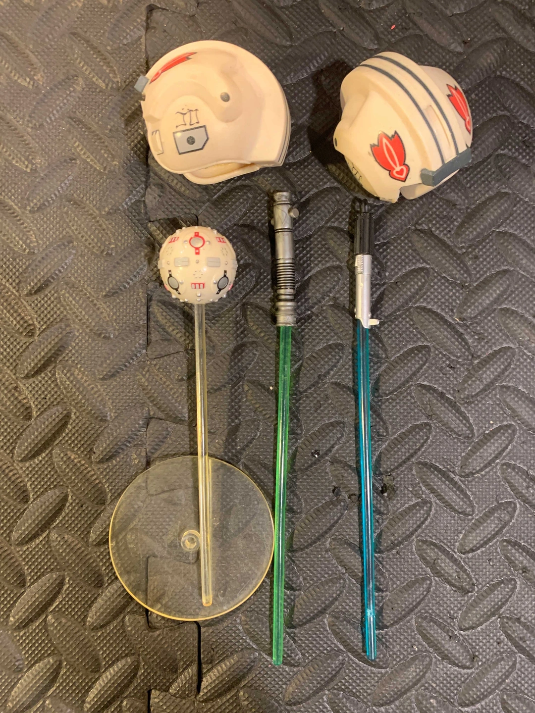 -Comes with 2x training helmets & lightsabers, 1x training droid with stand
