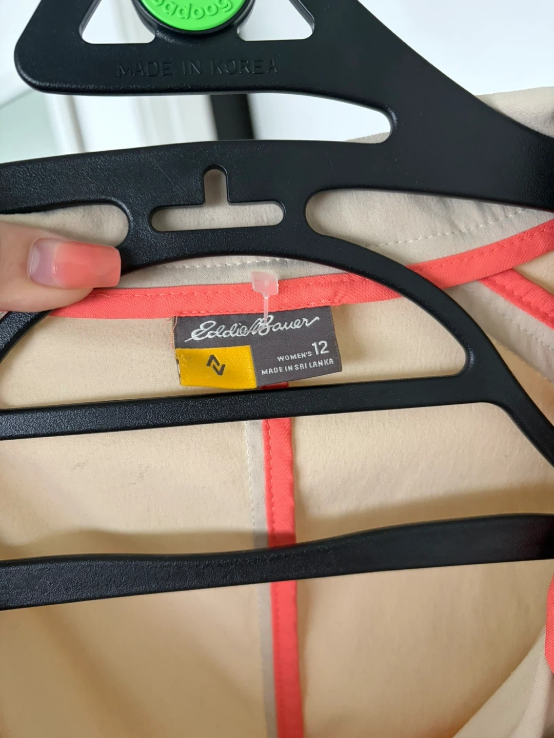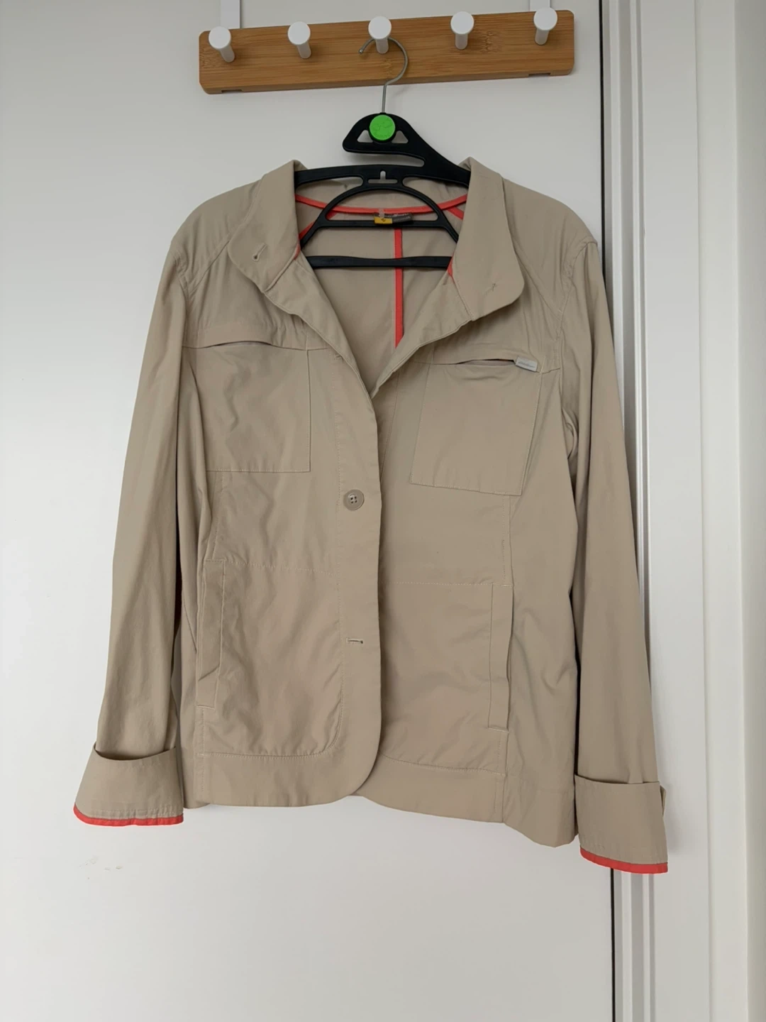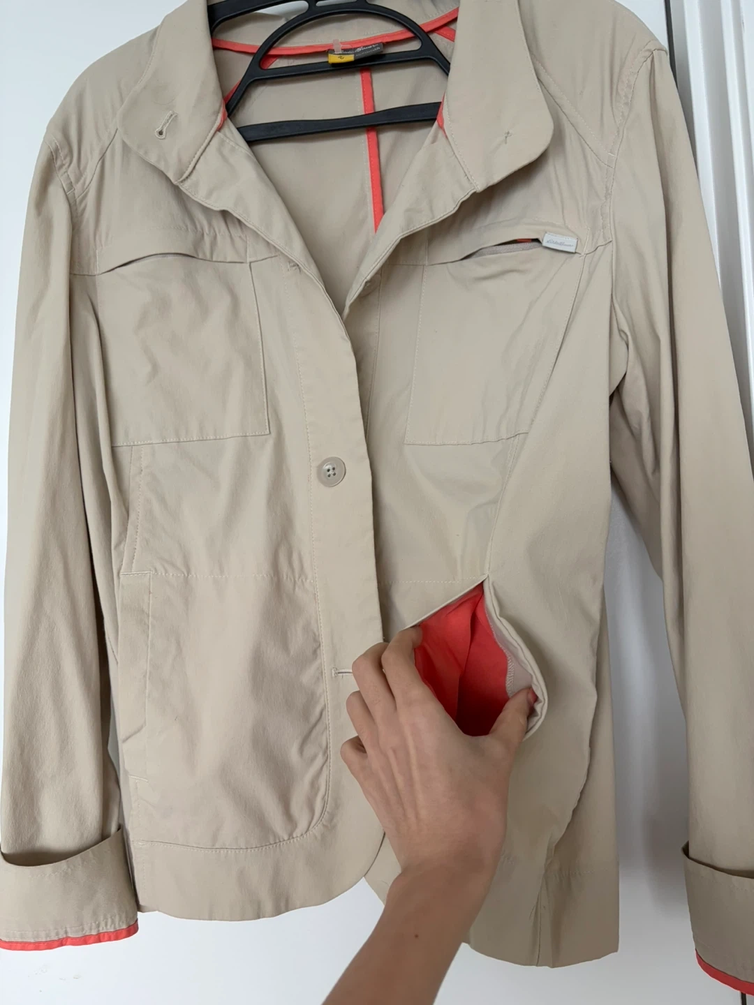Eddie Bauer beige blazer with coral lining. Women's size 12 but fits more like loose medium. Made in Sri Lanka. Light stain on the back. Very comfortable
