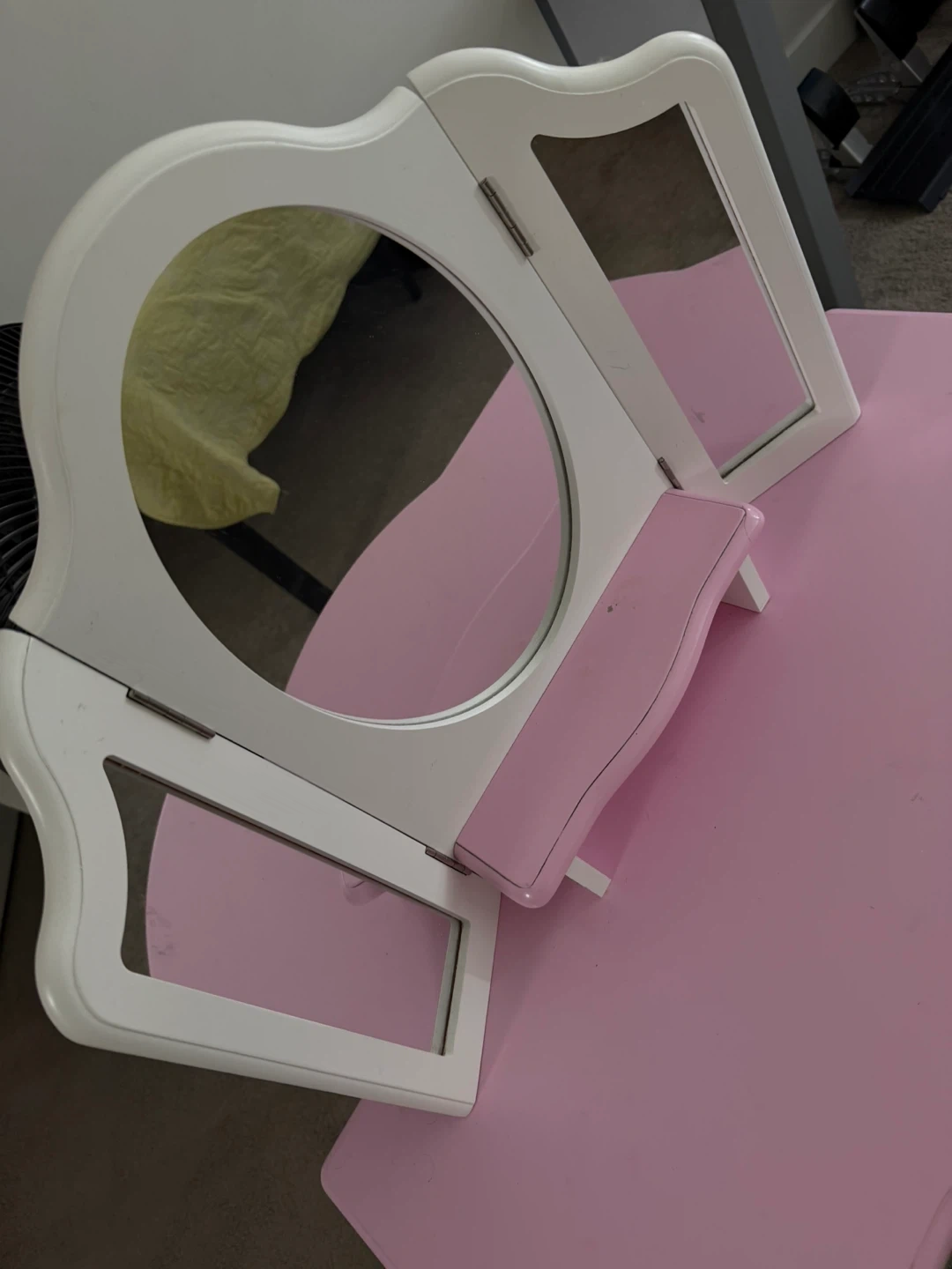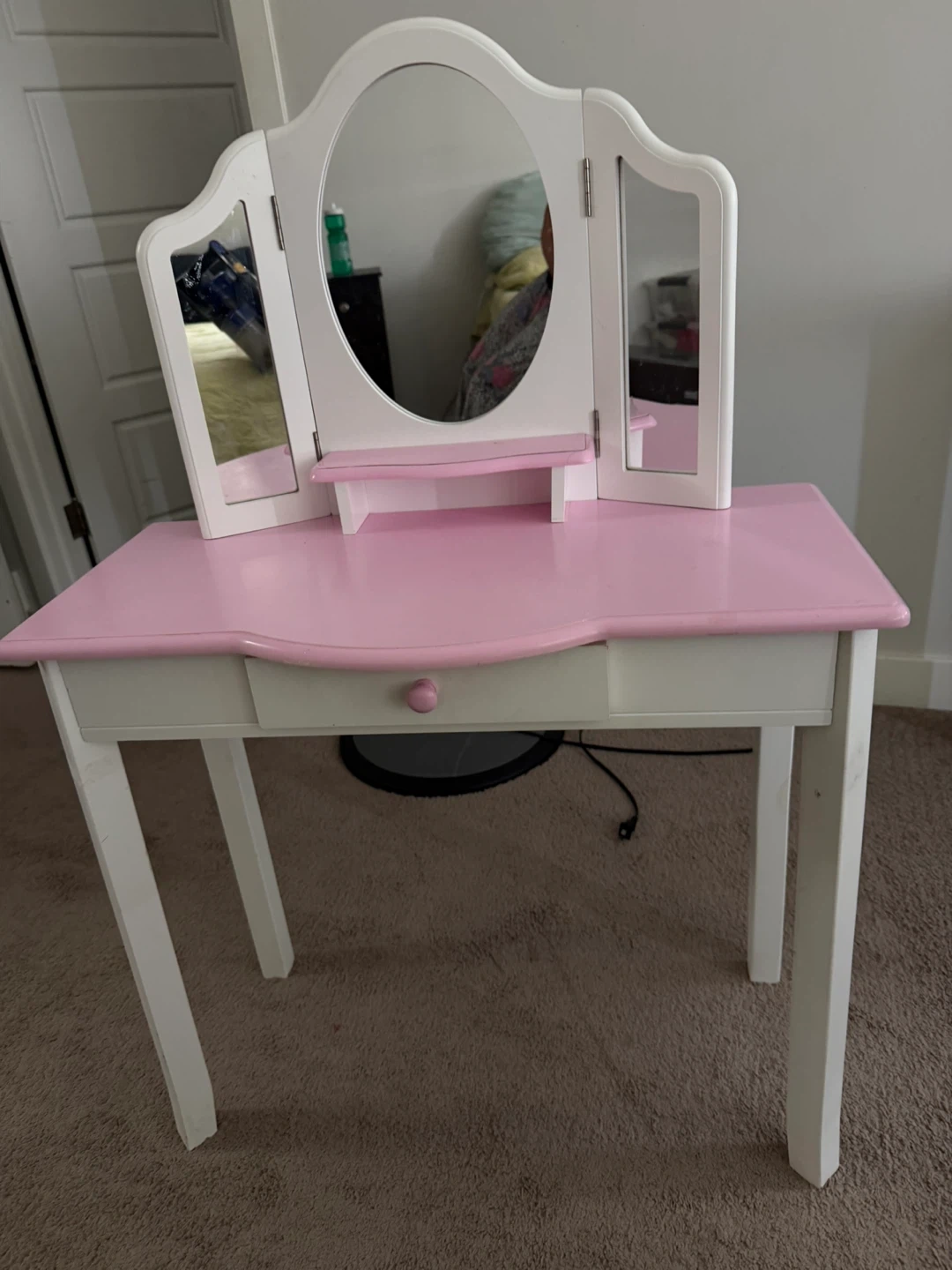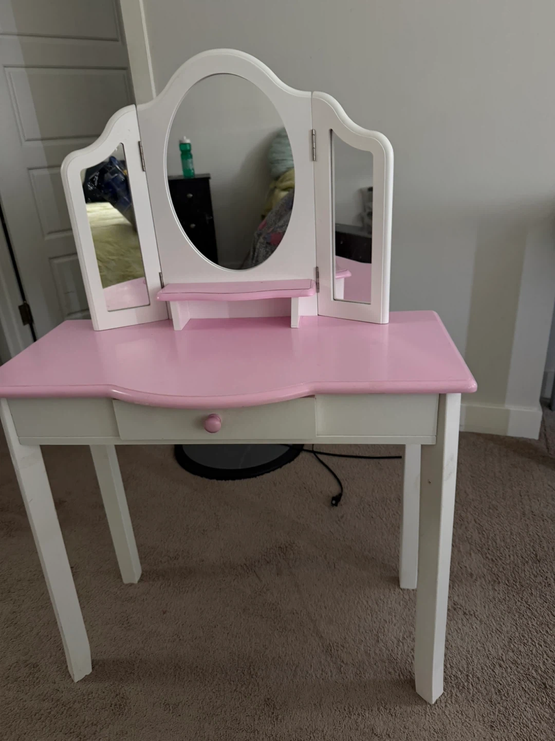 Adorable pink and white kids vanity set. It's got a tri-fold mirror and a single drawer for storing treasures. Perfect for a little one's pretend play! Made of wood composite.