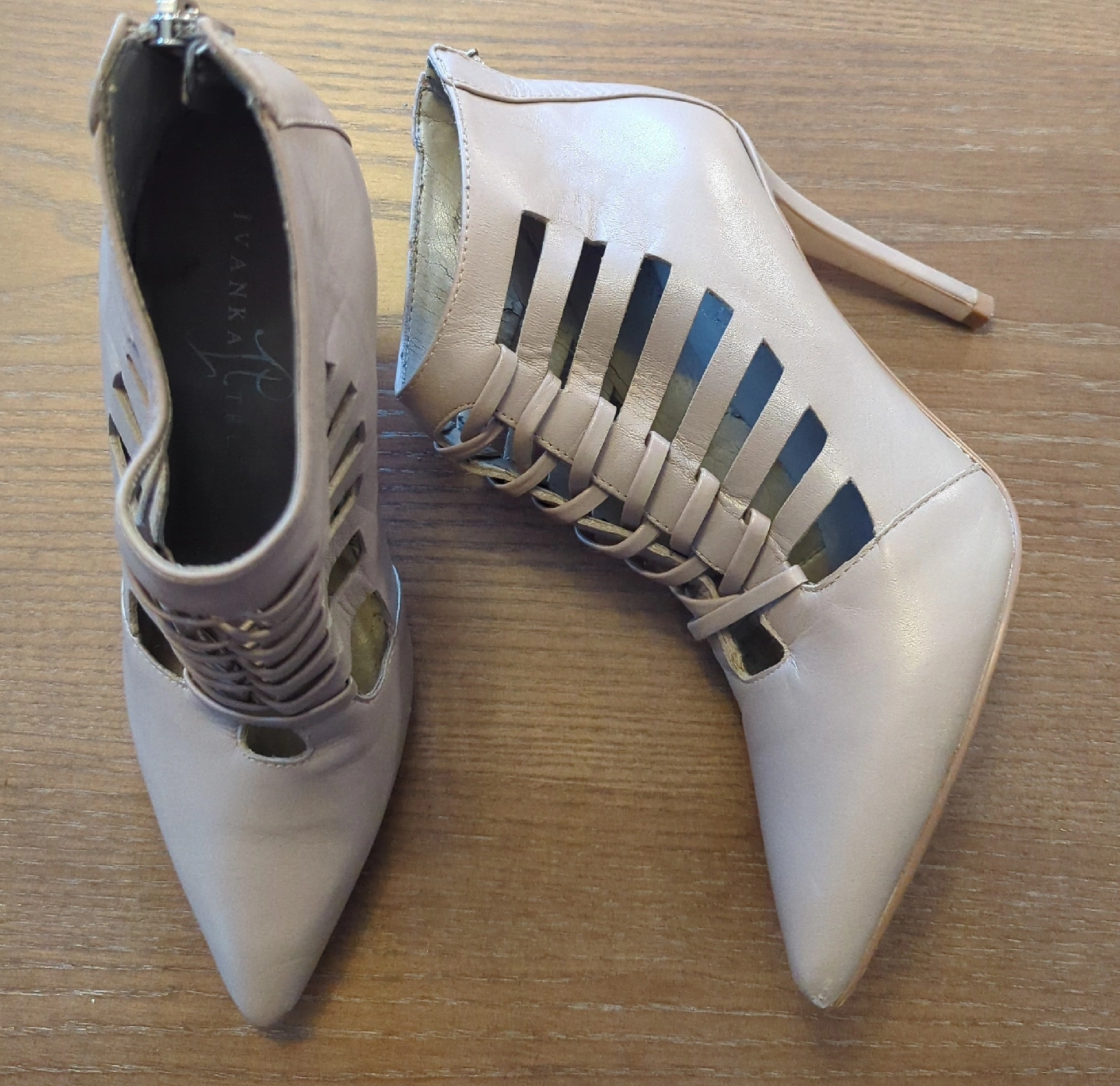 These Ivanka heels are a stylish addition to any wardrobe! They are a size 6 and feature a unique cut-out design. The heel height is approximately 3 1/2 inches. Upper, heels and sole made of leather and the rest is synthetic. Perfect for a night out or adding a touch of elegance to your everyday look.