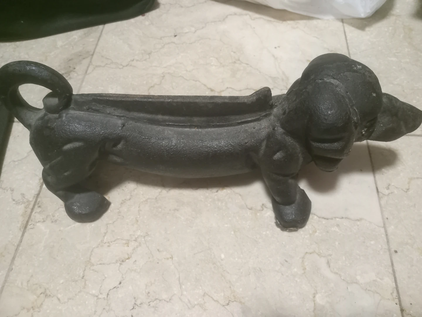 This cast iron dog is a fun, decorative log holder for your fireplace. It's designed in the shape of a dachshund, perfect for adding a whimsical touch. Made from durable cast iron, it's built to last! Also it's a doorstop with shoe cleaning