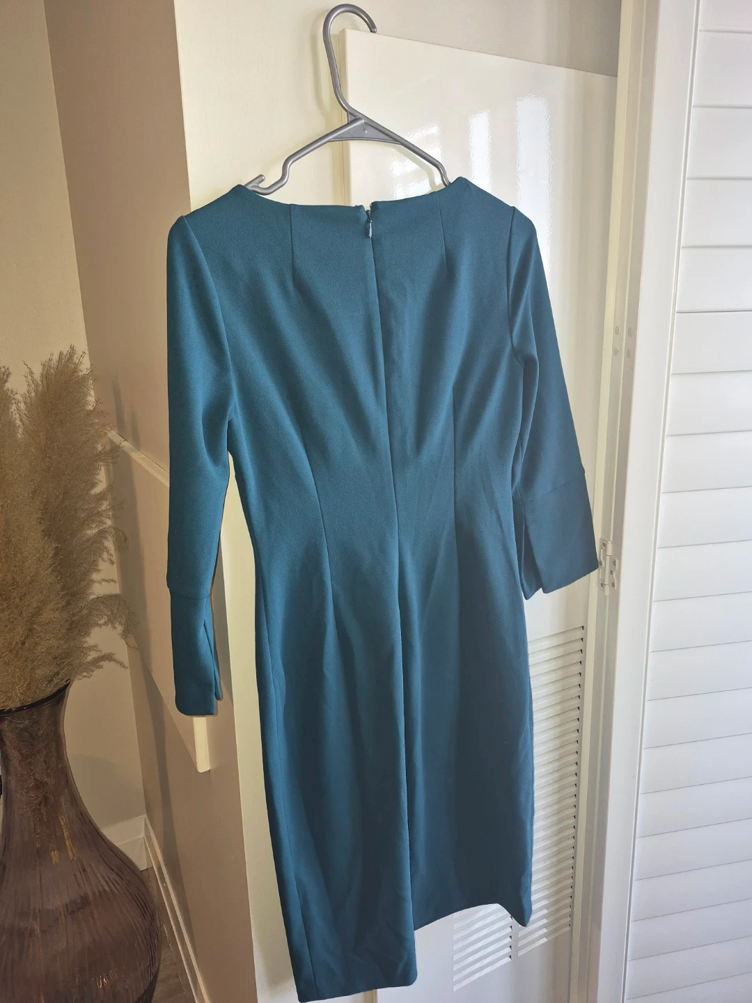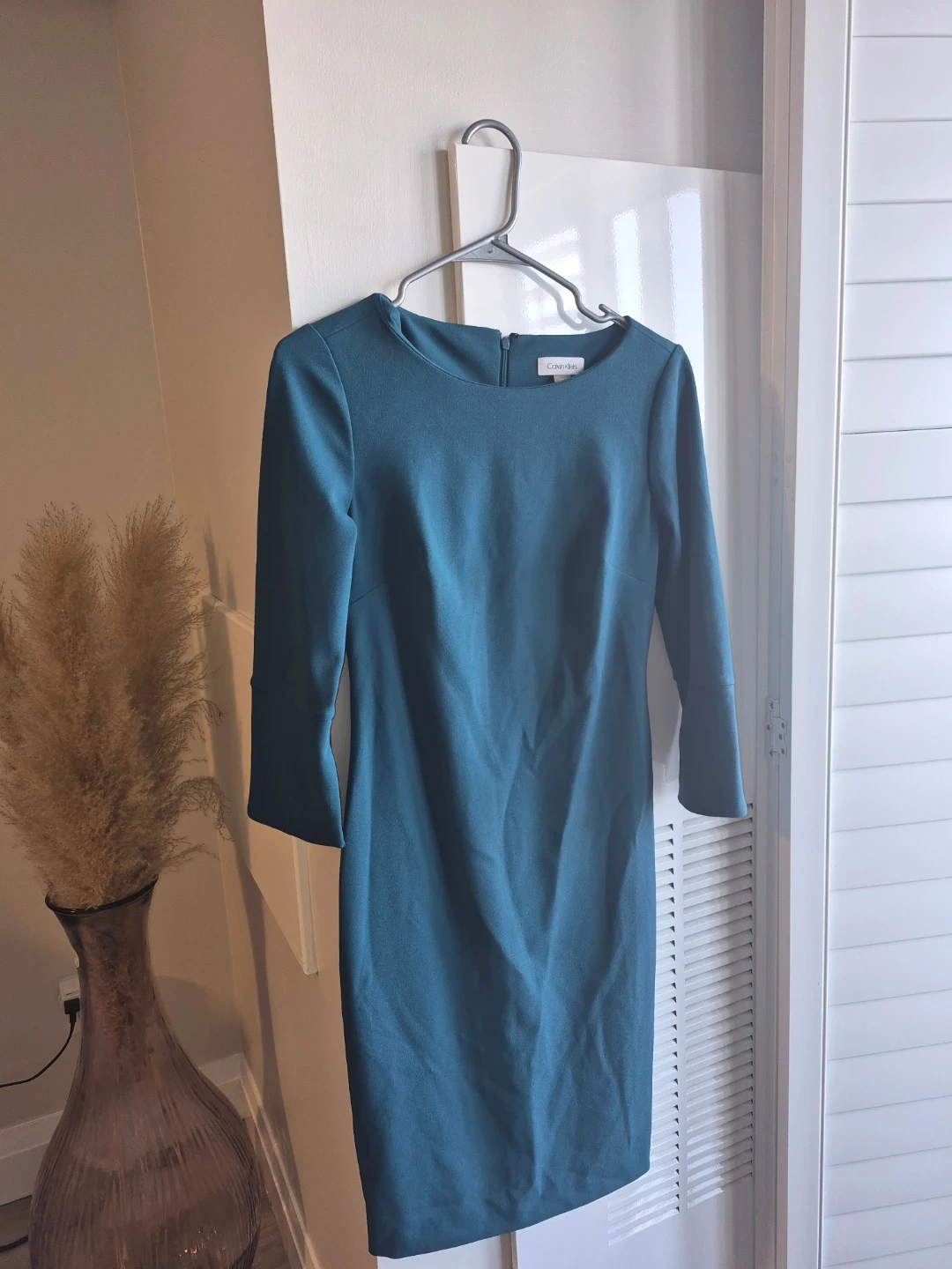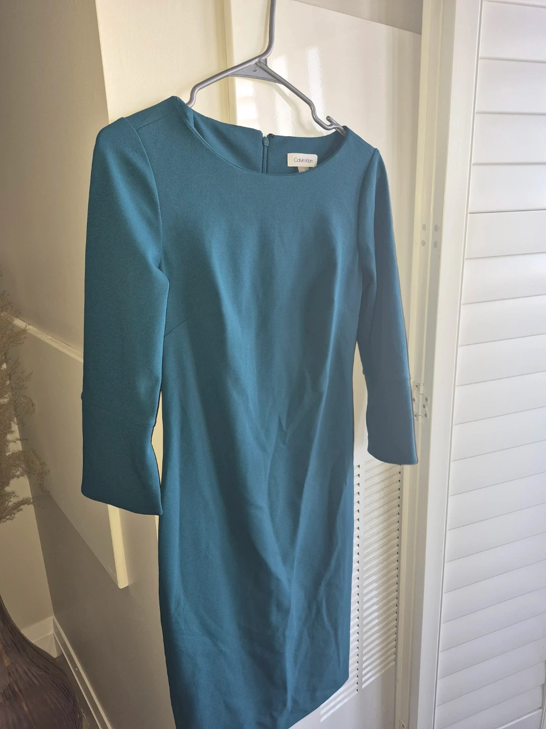 This Calvin Klein sheath dress comes in a lovely teal colour. It features long sleeves and a classic silhouette. It's a versatile piece for work or evening events!