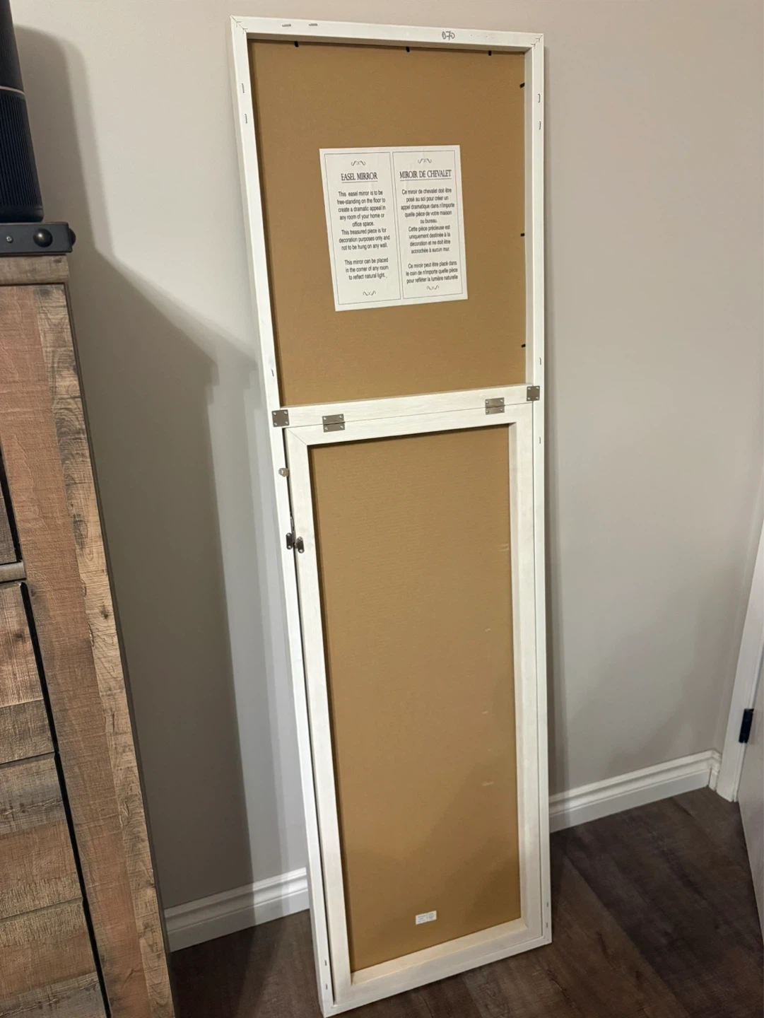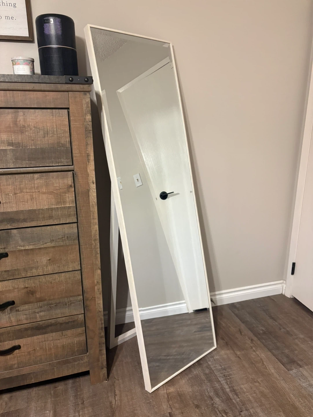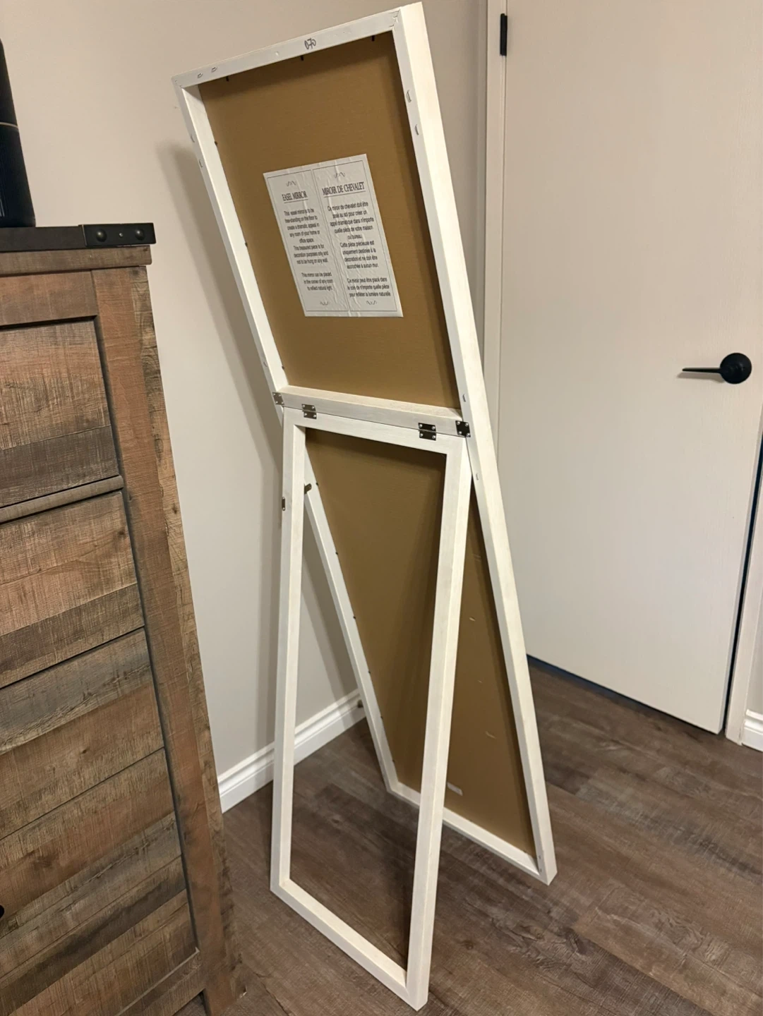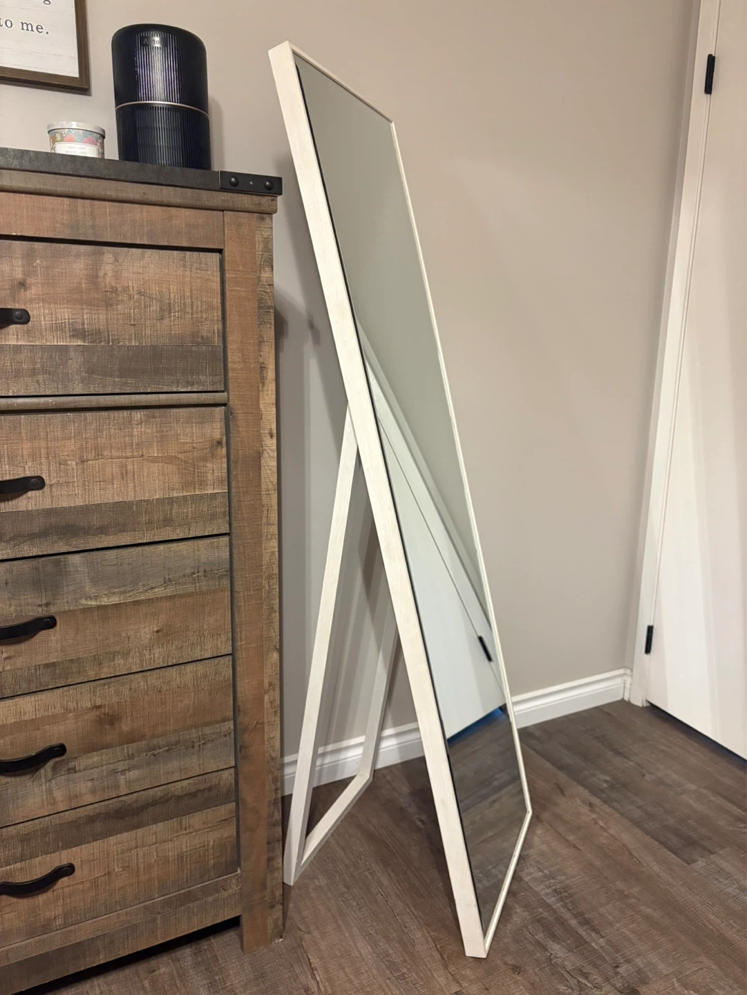Full-length easel mirror with a white frame. It's designed to stand on the floor, making it easy to place anywhere in your room. Great for checking outfits before heading out!
