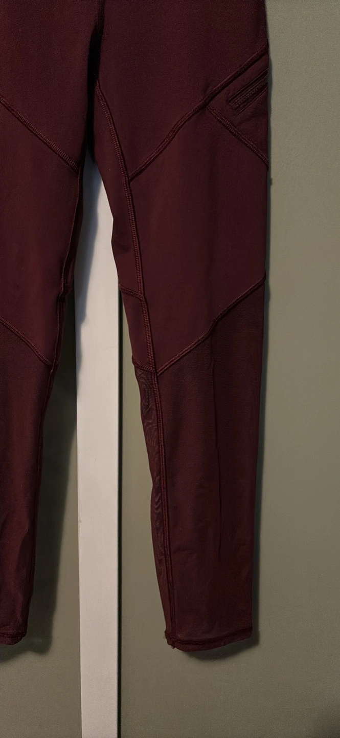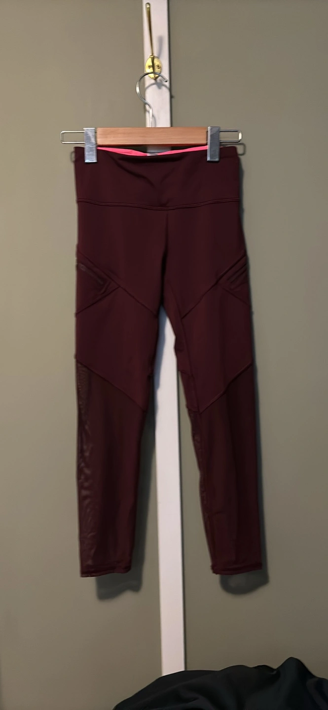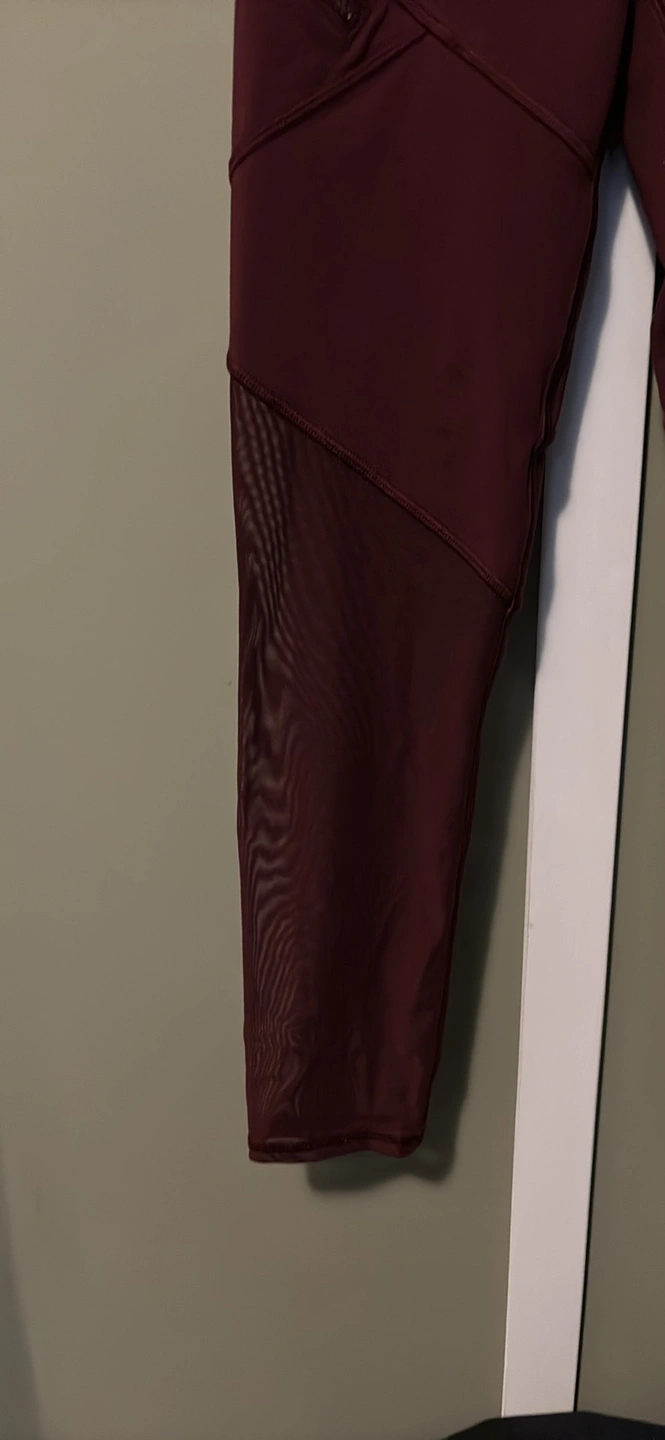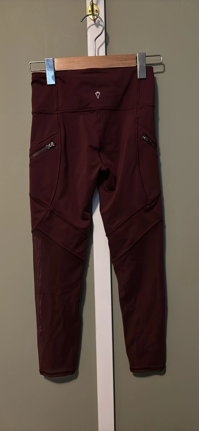 12Red-purple leggings with mesh panels and side zipper pockets.