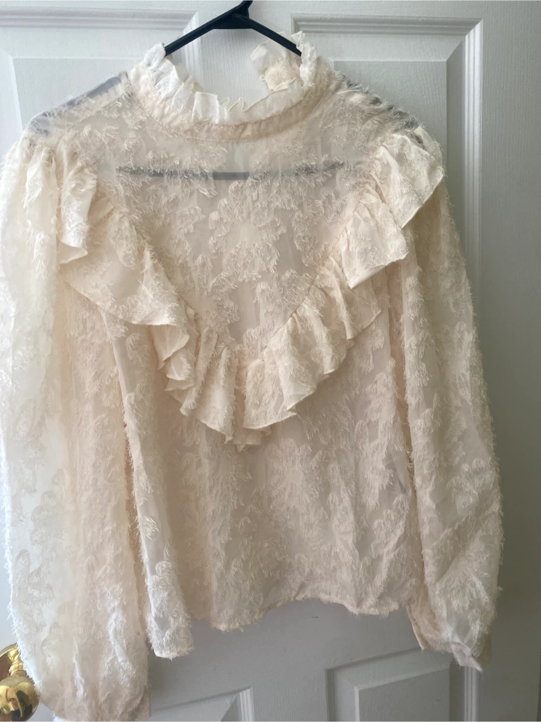 ivory lace blouse with soft ruffle details and sheer textured fabric for a romantic, vintage-inspired look. Features long puff sleeves and a high neckline — perfect for pairing with skirts or tailored pants for an effortlessly feminine style. Size: Small • Color: Ivory • Material: Lace with inner lining (sheer texture) • Fit: Amal size • Condition: Excellent, Never worn, brand new